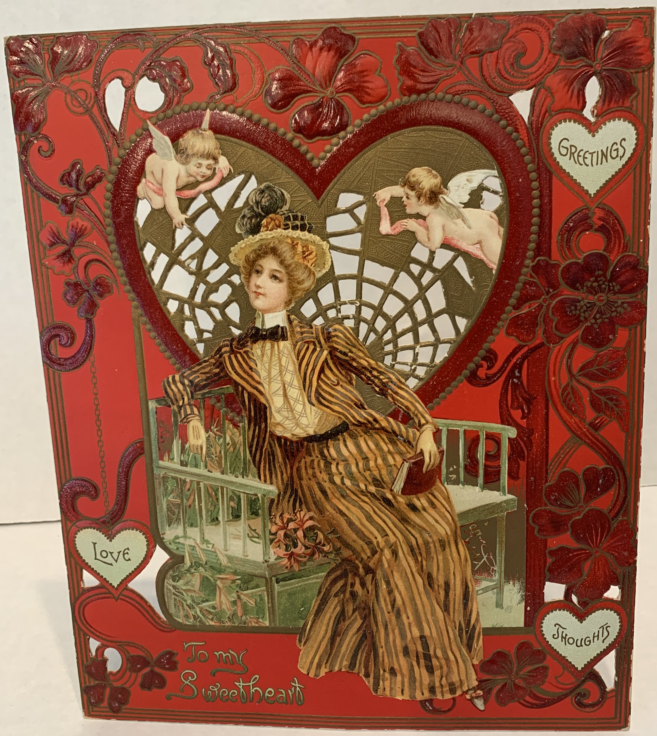 Valentine, glamor girl, spider web, cupids, stand up panel, R. Tuck circa 1905