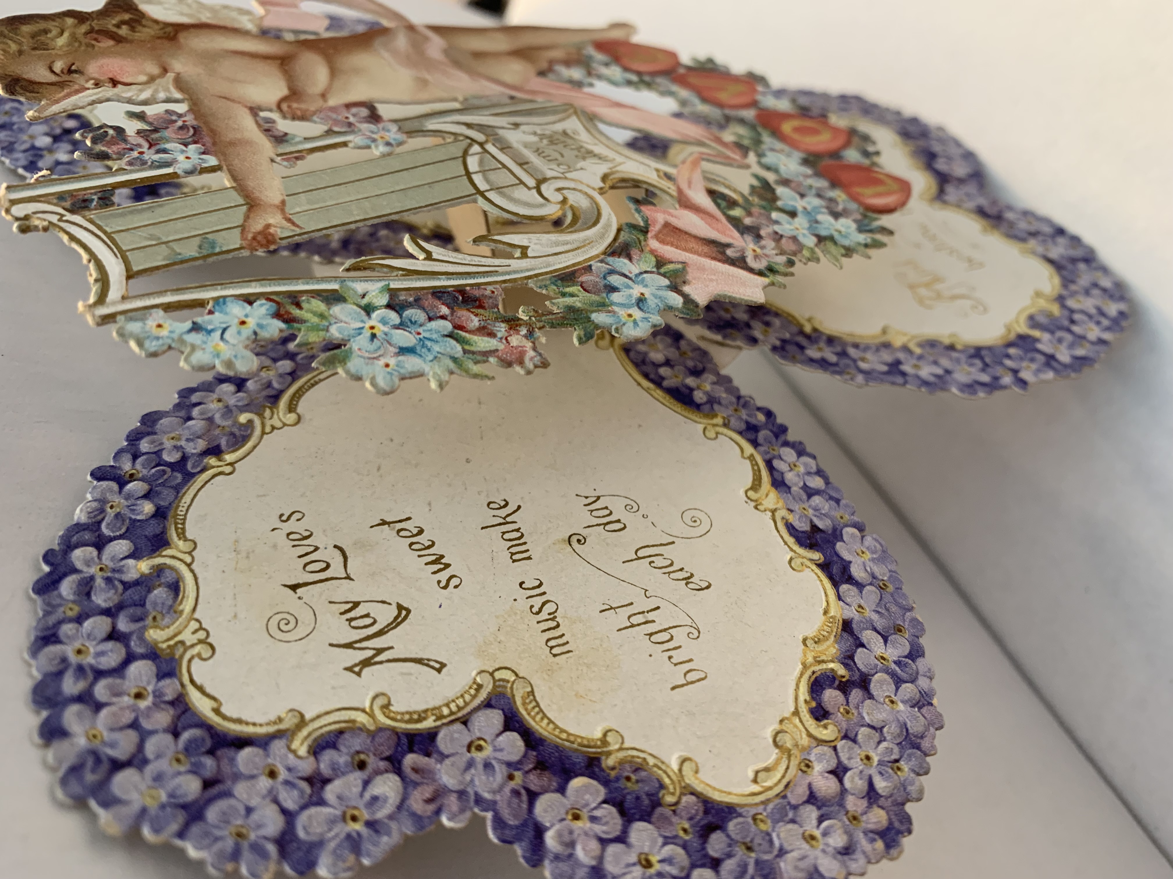 FOR MY VALENTINE, Cupid with harp, hinged centre piece, 4 panels