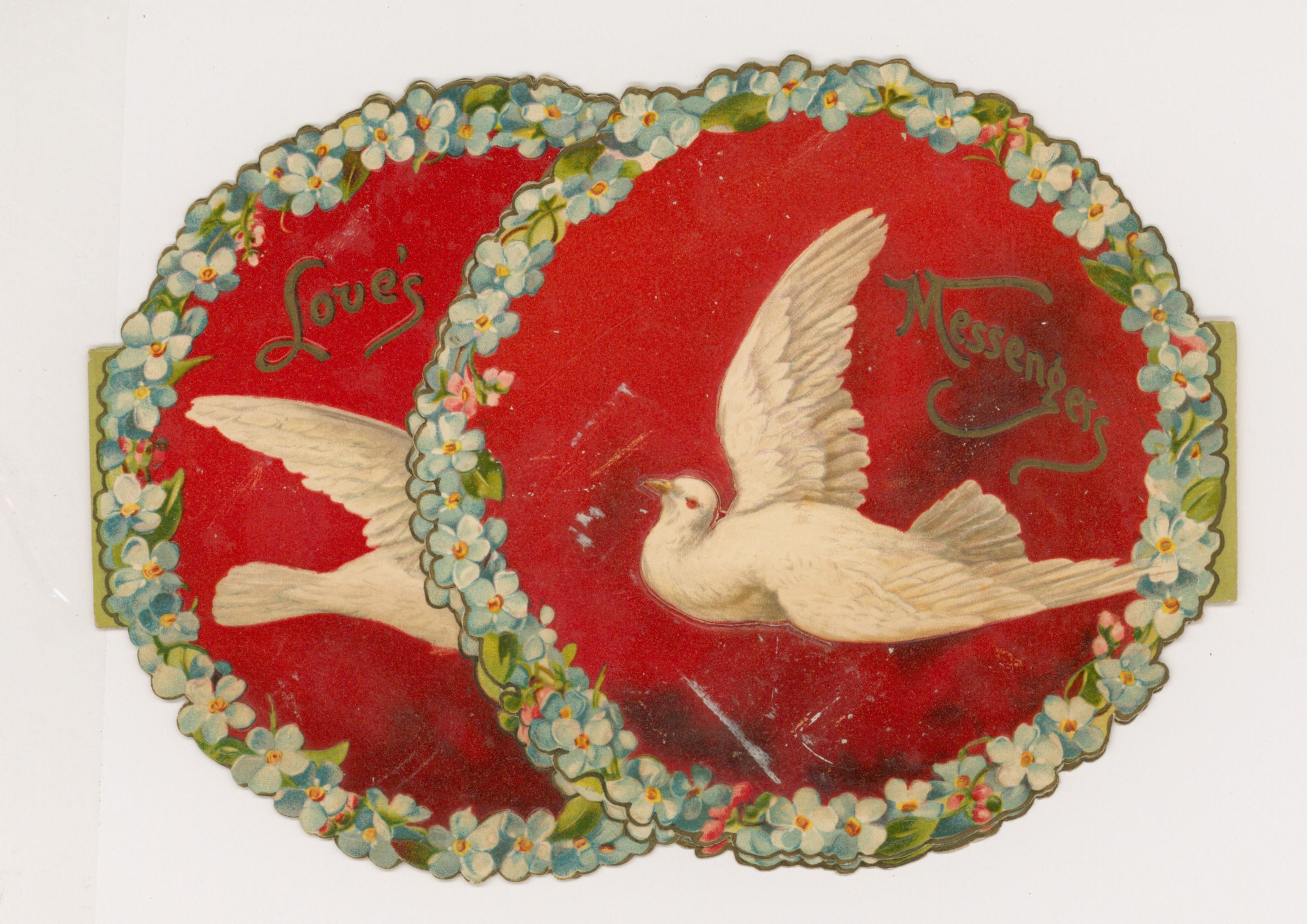 LOVE'S MESSENGERS, folded greeting, red panels with white dove birds