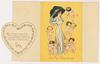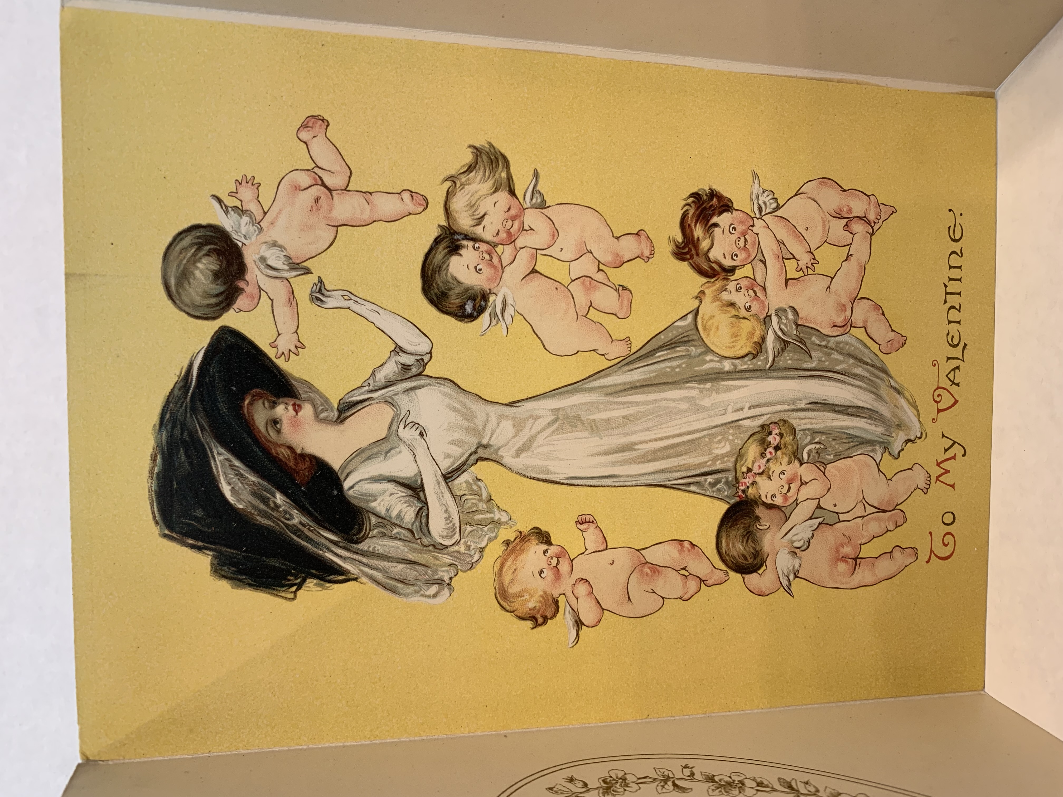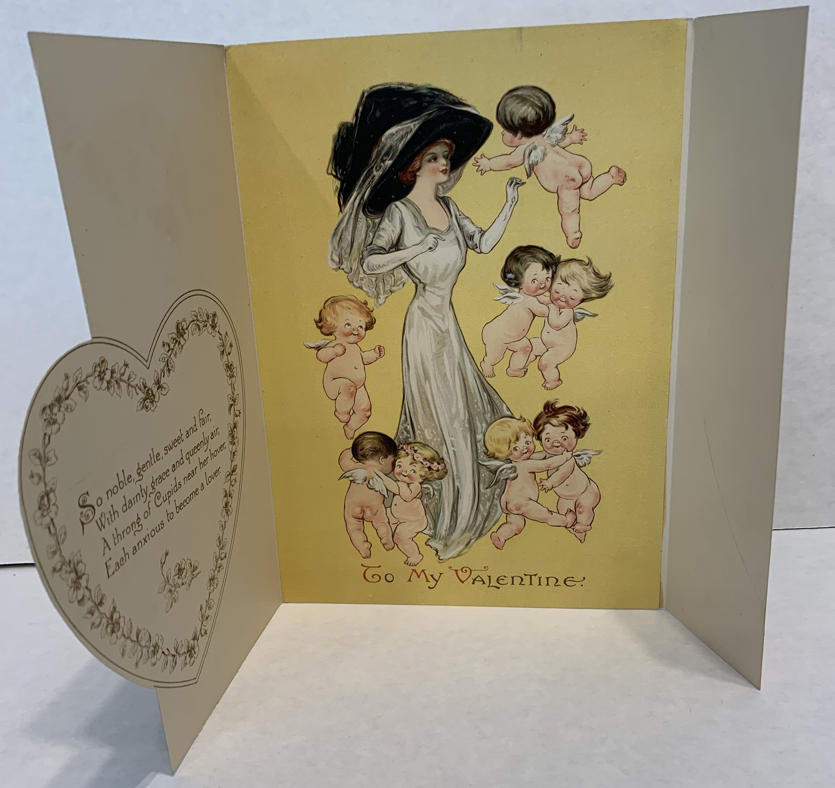 inside panel, SO NOBLE, GENTLE, SWEET AND FAIR, WITH DAINTY GRACE AND QUEENLY AIR, A THRONG OF CUPIDS NEAR HER HOVER, EACH ANXIOUS TO BECOME A LOVER.