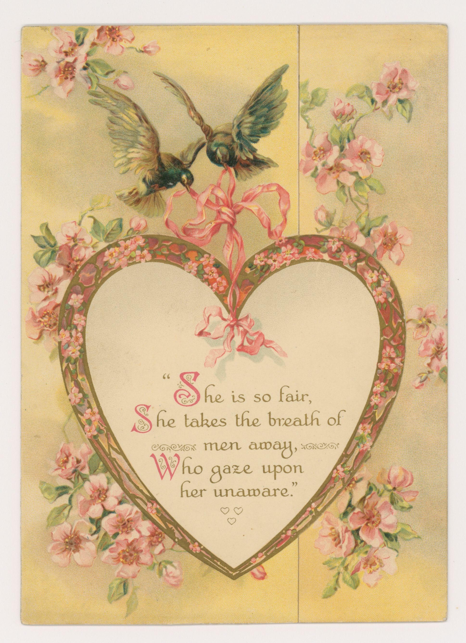 SHE IS SO FAIR, SHE TAKES THE BREATH OF MEN AWAY, folded greeting, birds, heart, ribbon