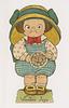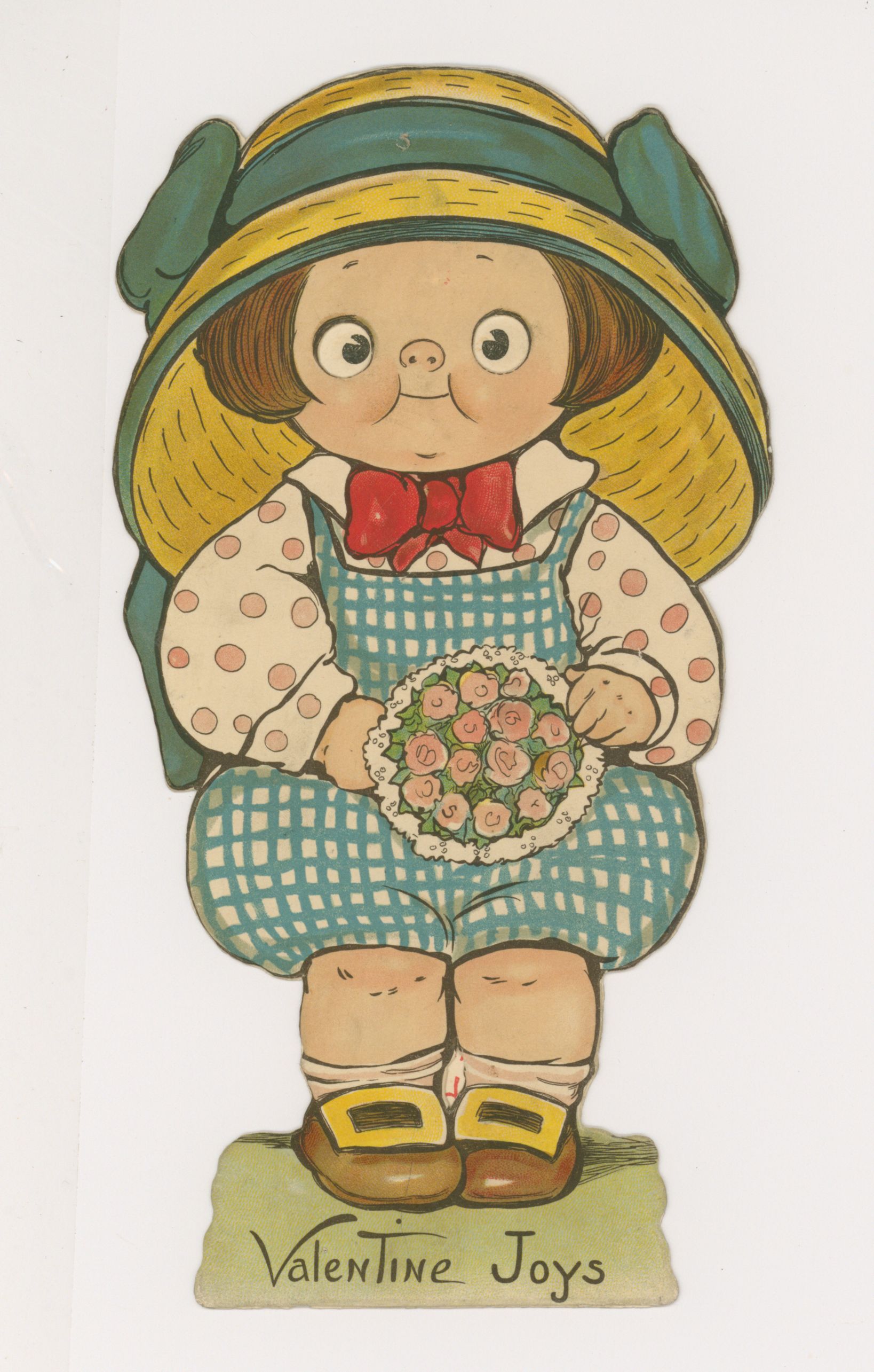 VALENTINE JOYS, child, large yellow hat with blue ribbon, stand up, eyes cut out