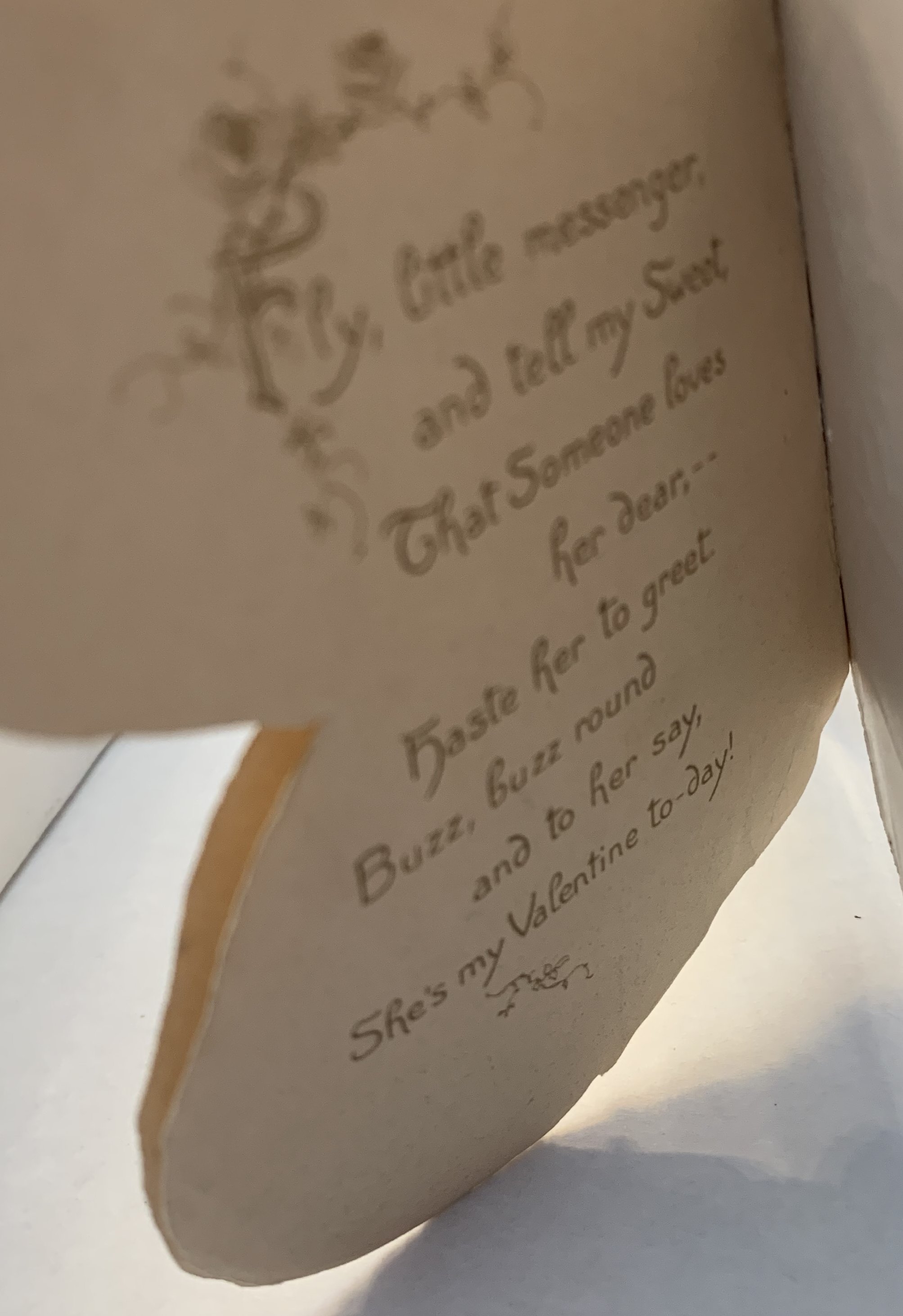 FLY, LITTLE MESSENGER, AND TELL MY SWEET, THAT SOMEONE LOVES HER DEAR,--HASTE HER TO GREET. BUZZ, BUZZ ROUND AND TO HER SAY, SHE'S MY VALENTINE TO-DAY!