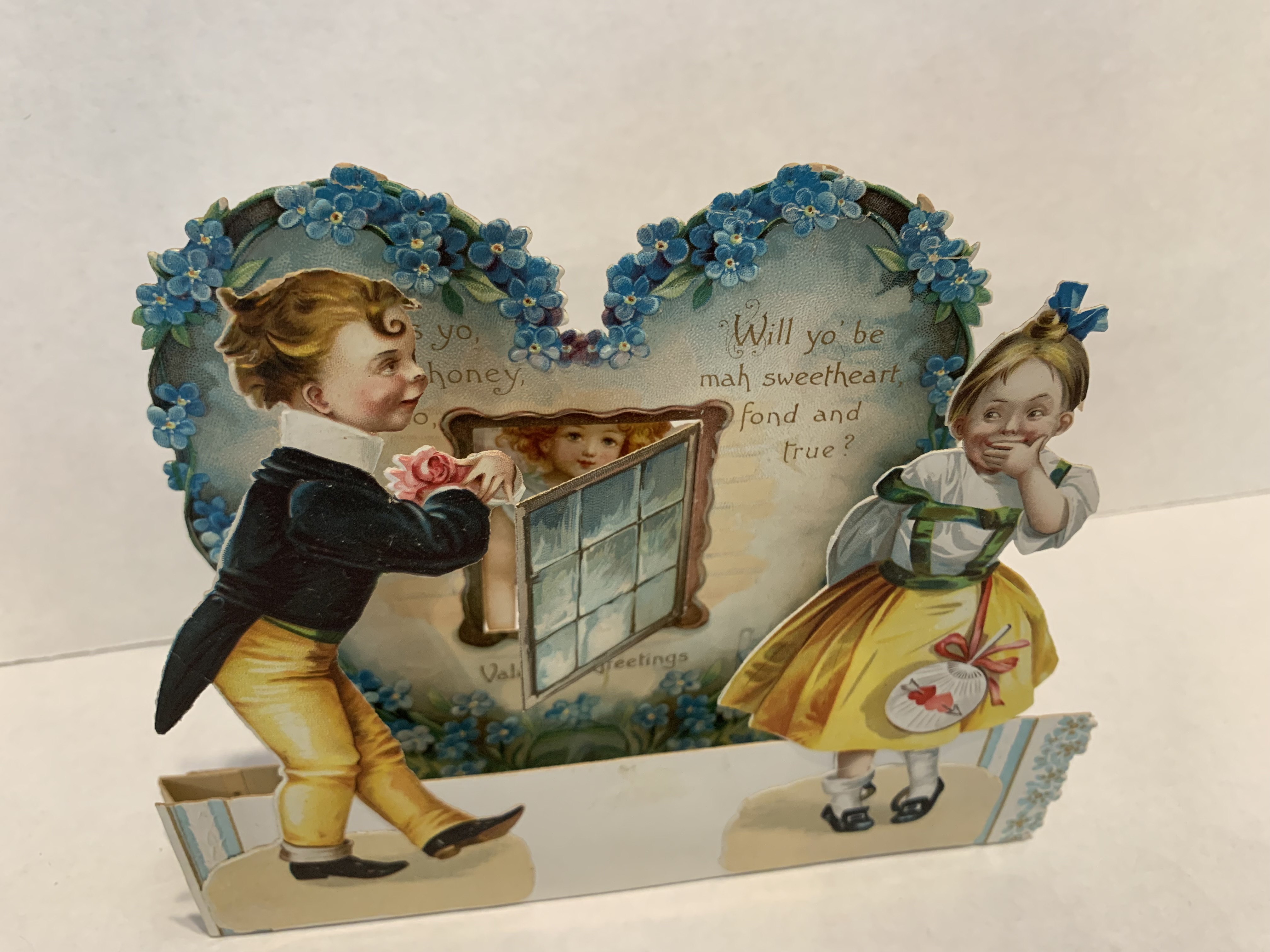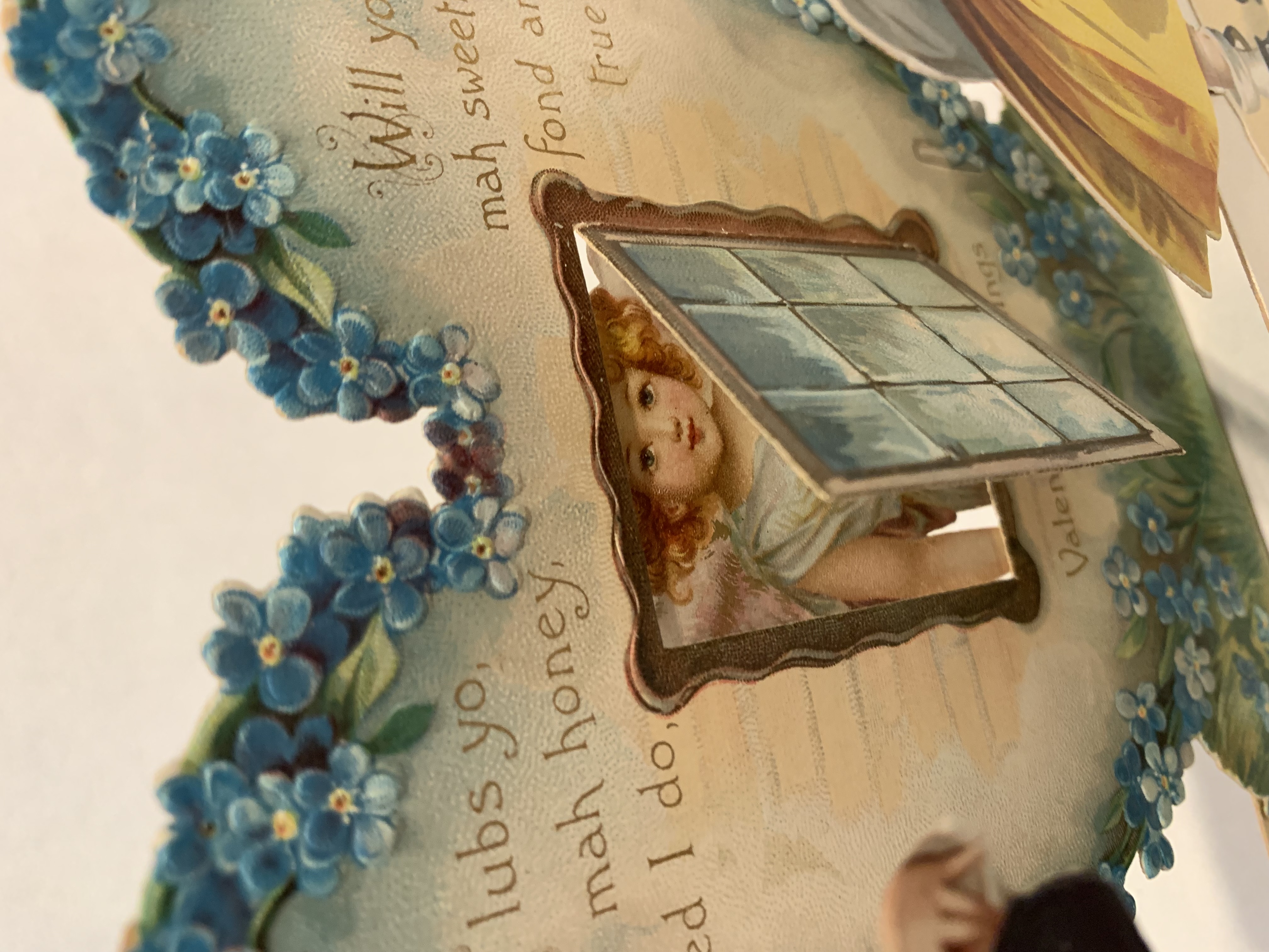 Valentine, heart shaped, blue forget me not border, windows open, Brundage artist