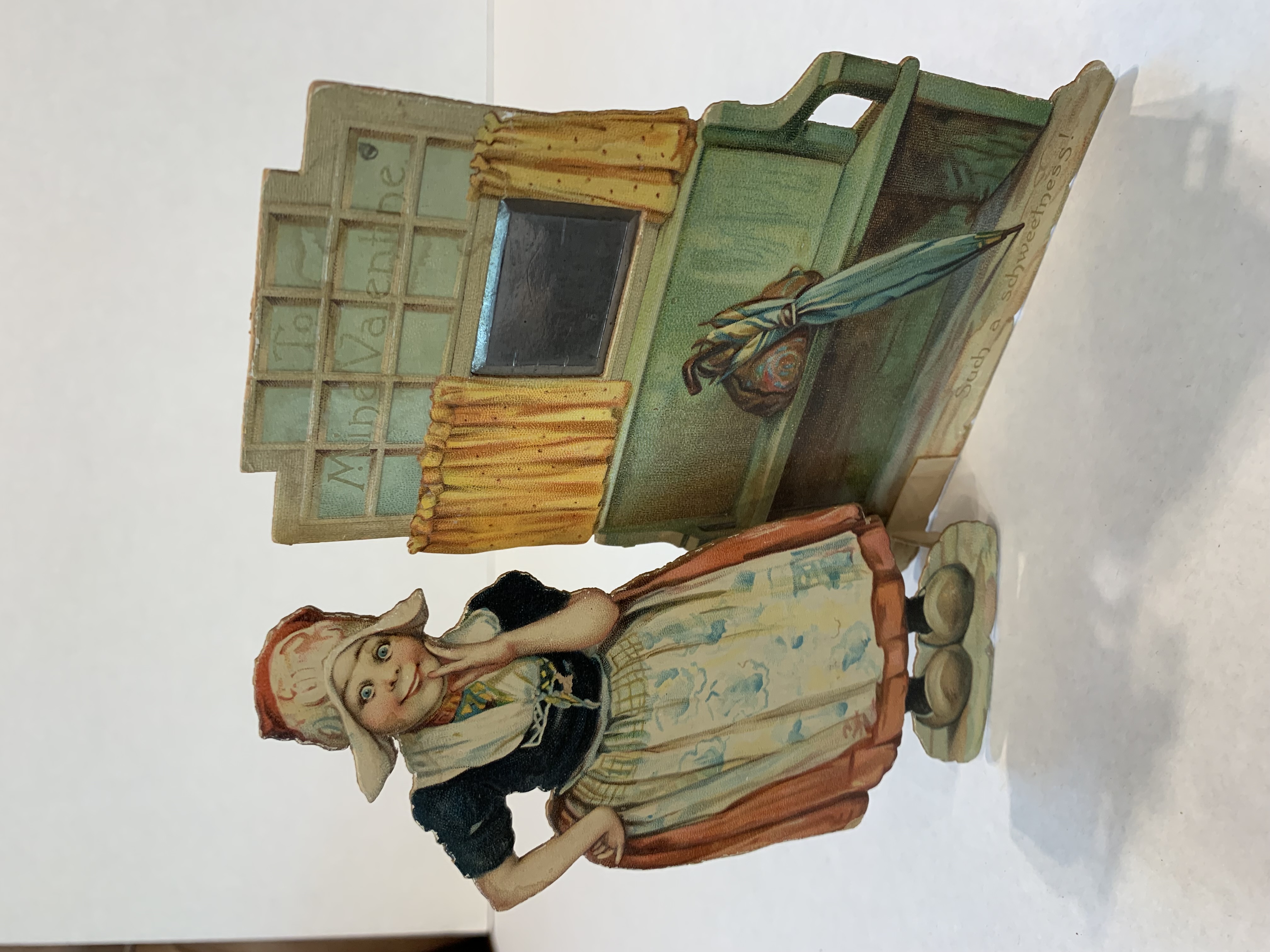 Valentine, woman with hat, metal window, mirror, fold out, Tuck circa 1905