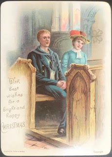 Sailor and lady in blue dress sat inside church on a pew
