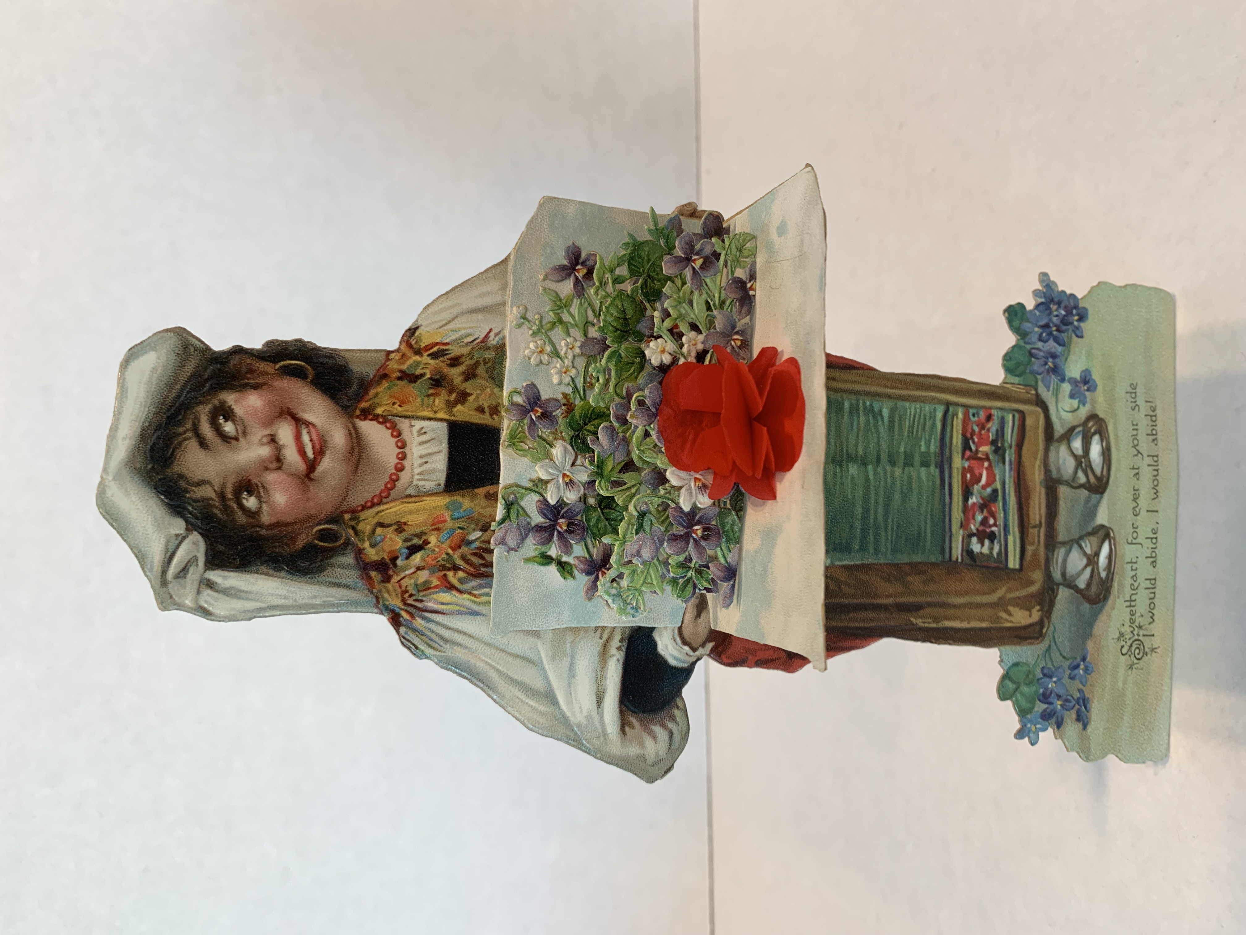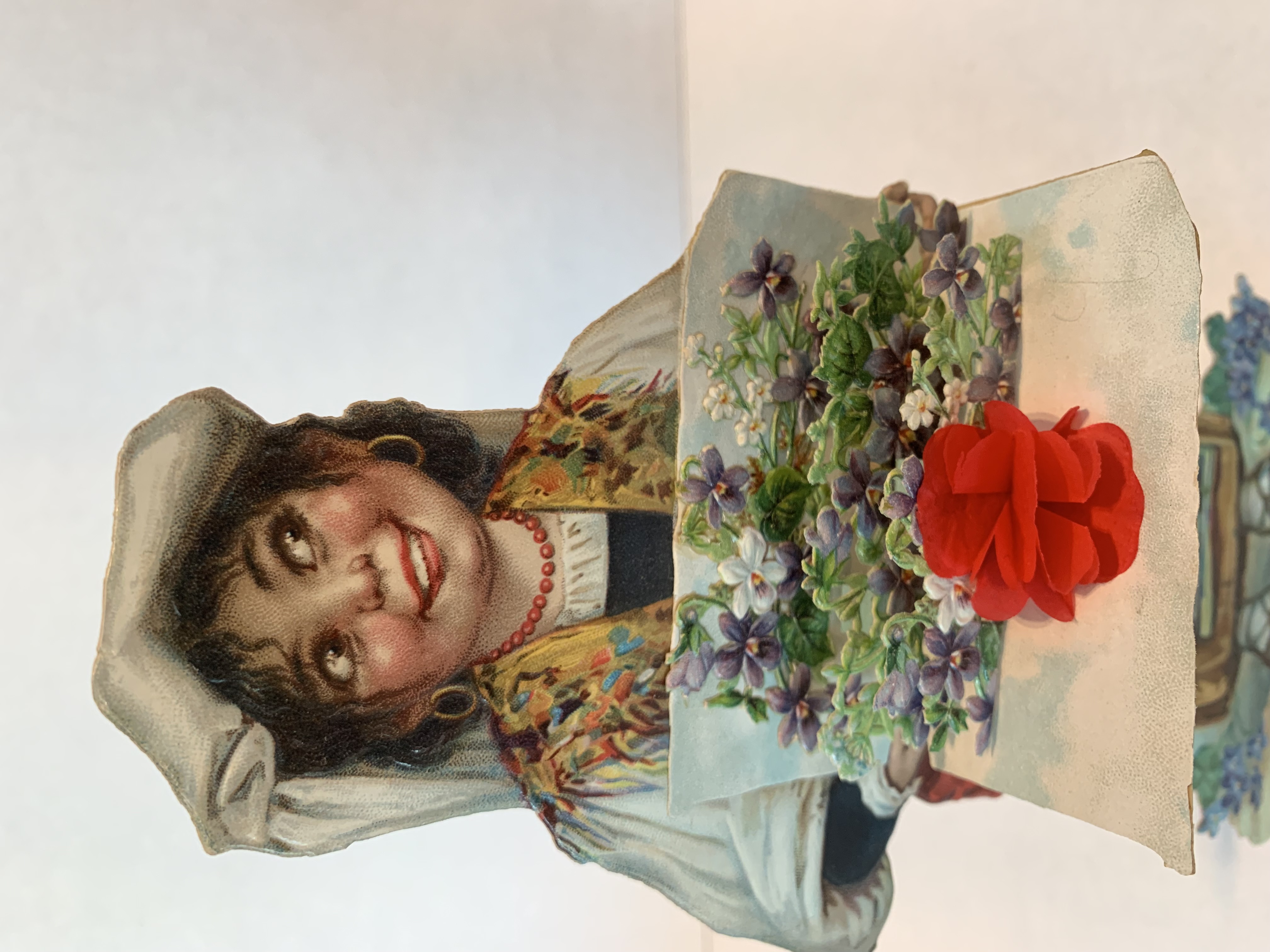 Valentine, Gypsy girl with wicker basket, mechanical fold down Tuck circa 1907