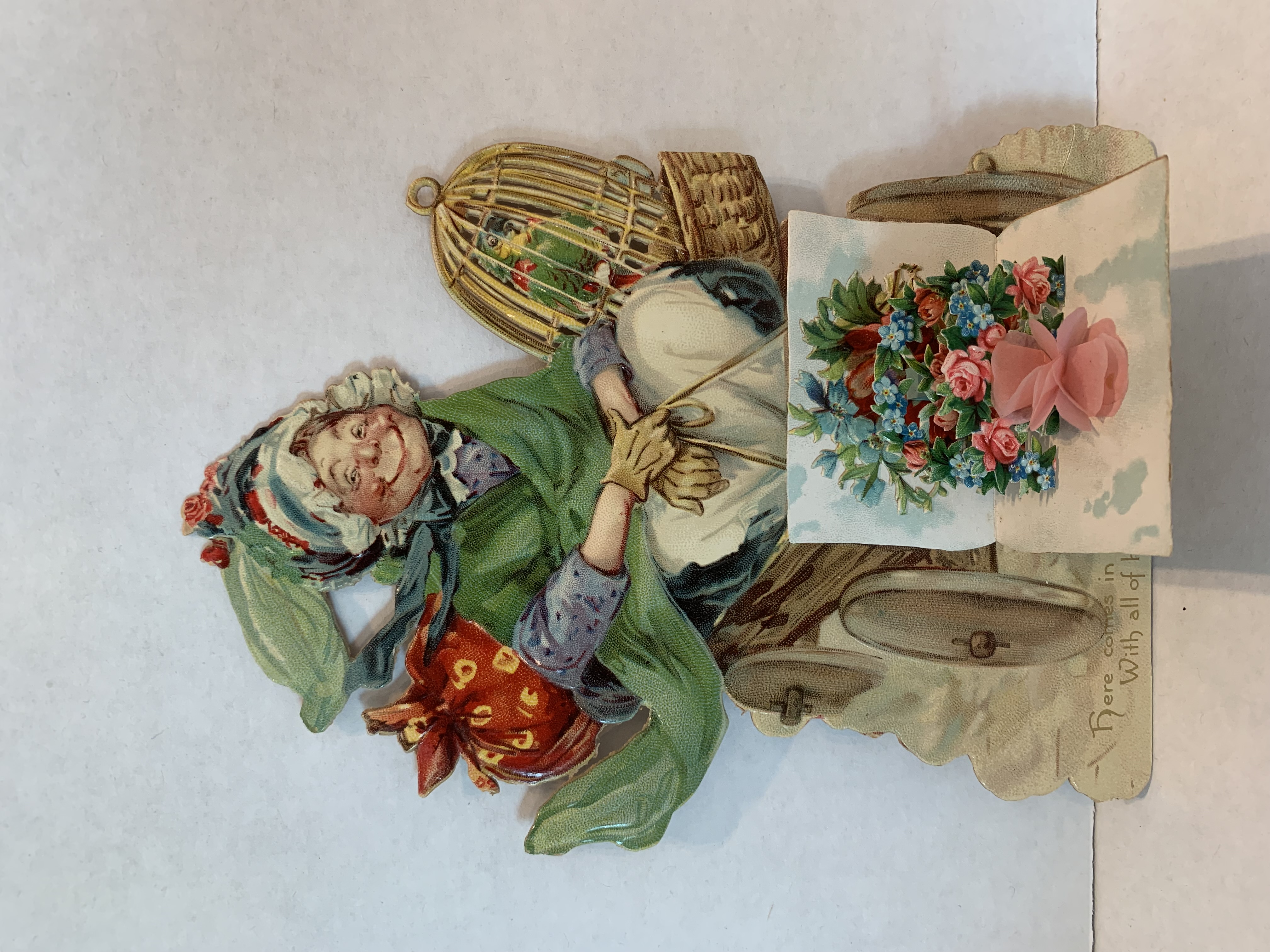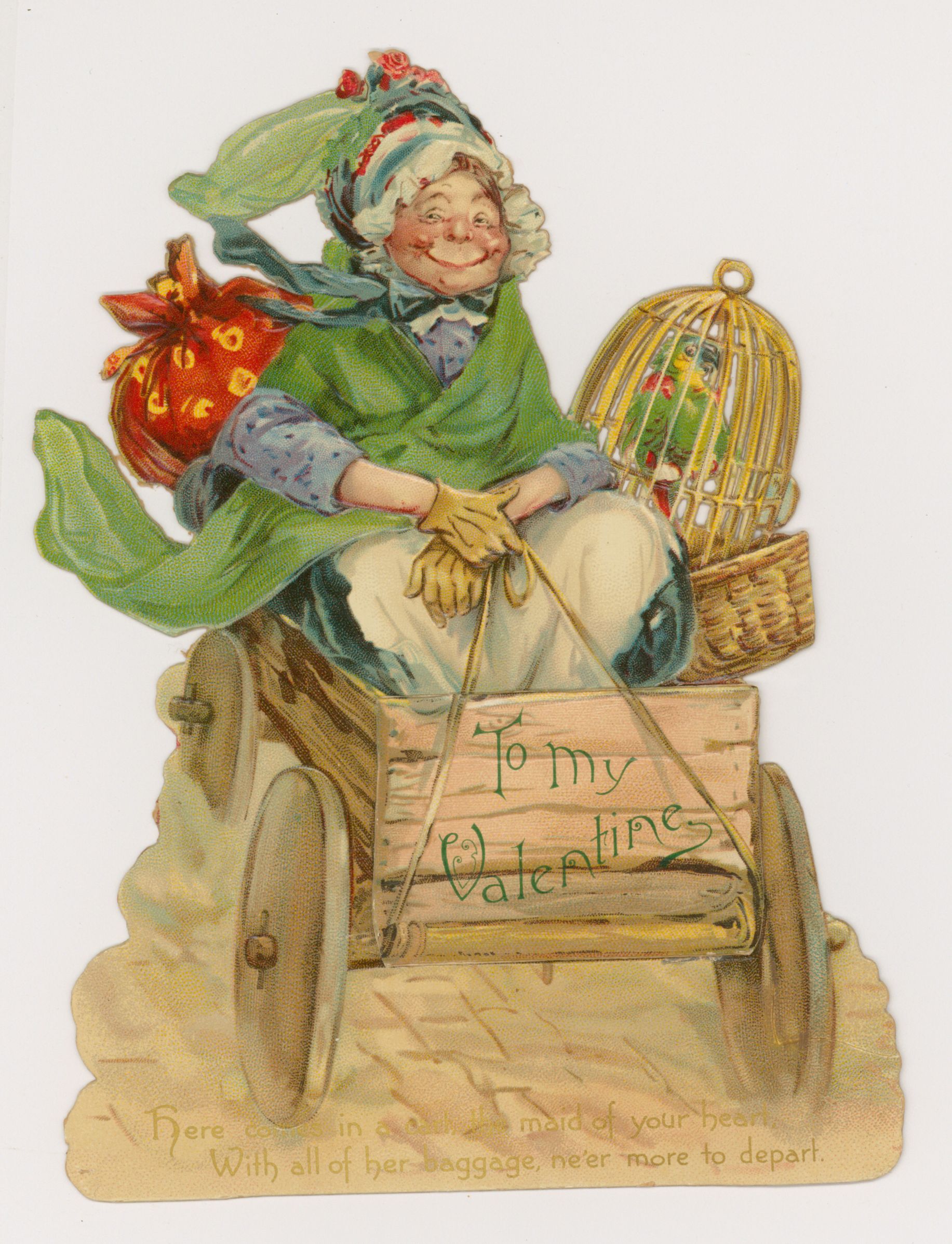 TO MY VALENTINE, Woman in a cart, parrot in a cage