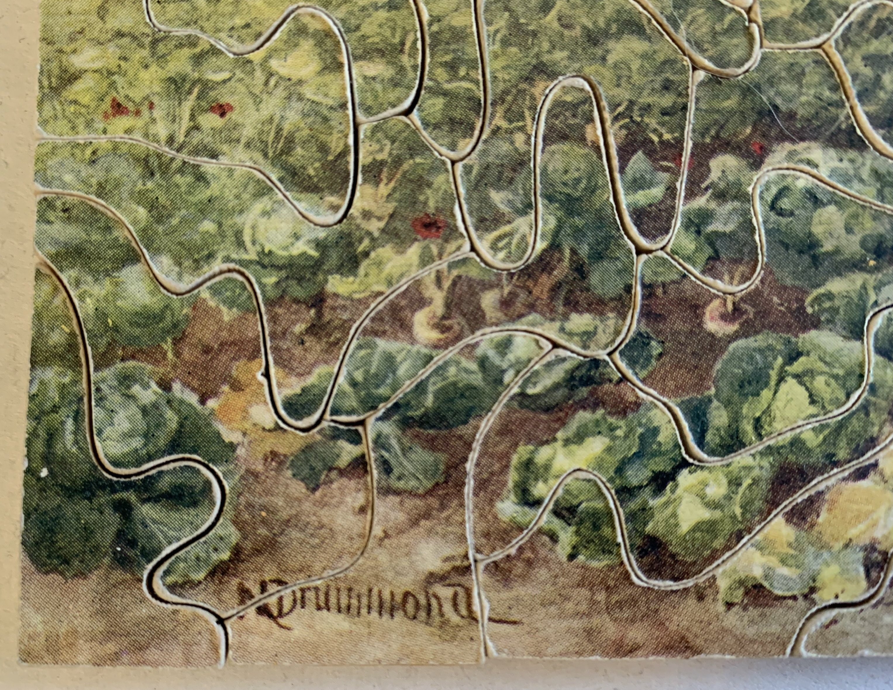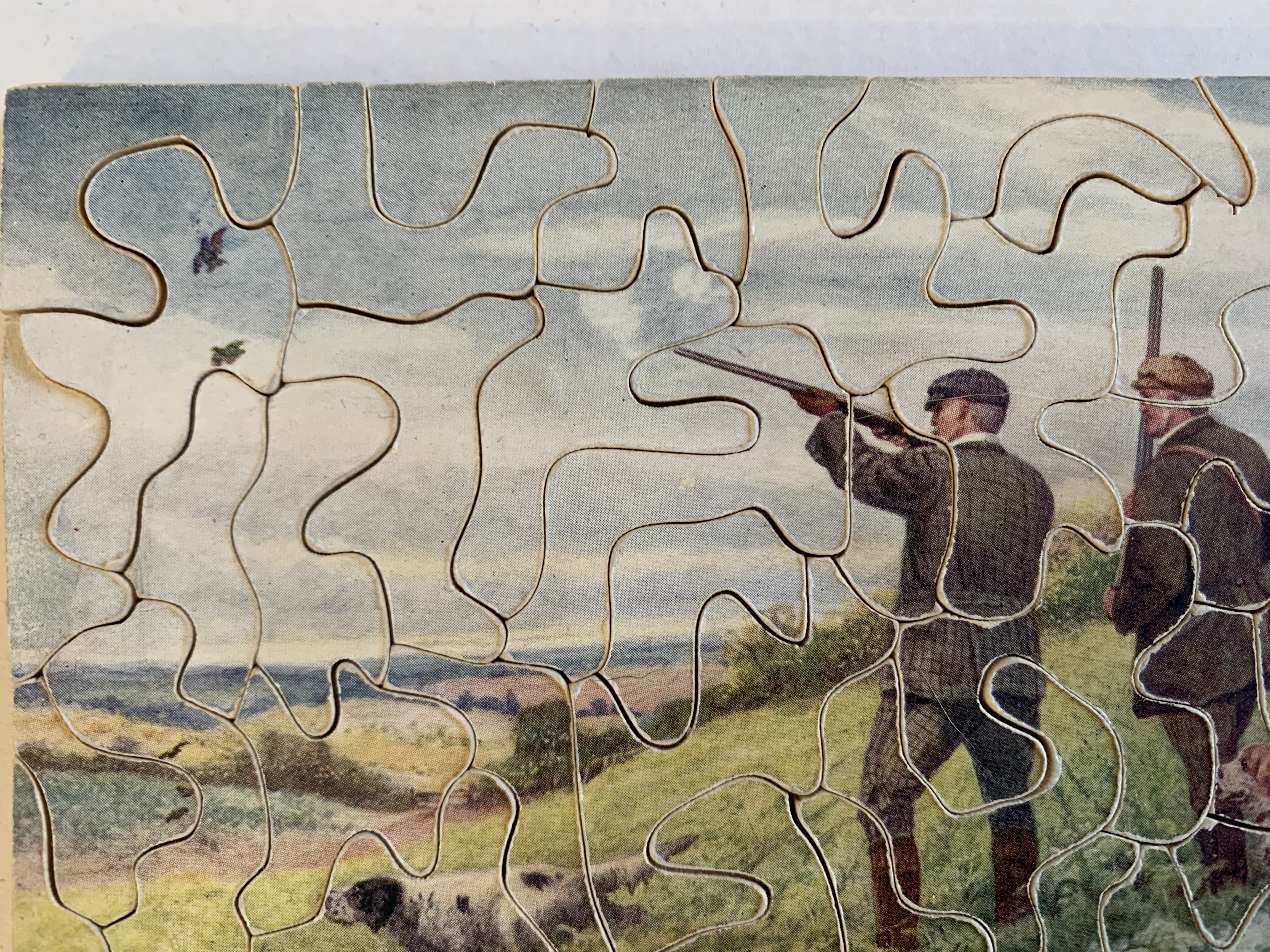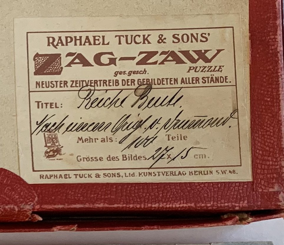 Zag-Zaw line of puzzles was first produced in 1909, most incorporate figurals or whimsies, sold in red, orange, or occasionally green boxes with labels on the side or bottom of the box, most without guide pictures. Initially cut non-interlocking but by 1930's became more so. Puzzles have a different cuts so that the same image will come in several versions which means that missing pieces can not be taken from other puzzles with the same image. The puzzle labels are often hand written and come with minor variations in titles and details. Some have a DESIGN category on the label. From my readings this refers to the style of cut, wavy lines, figurals, etc. See also Bob Armstrong's website on old jigsaw puzzles