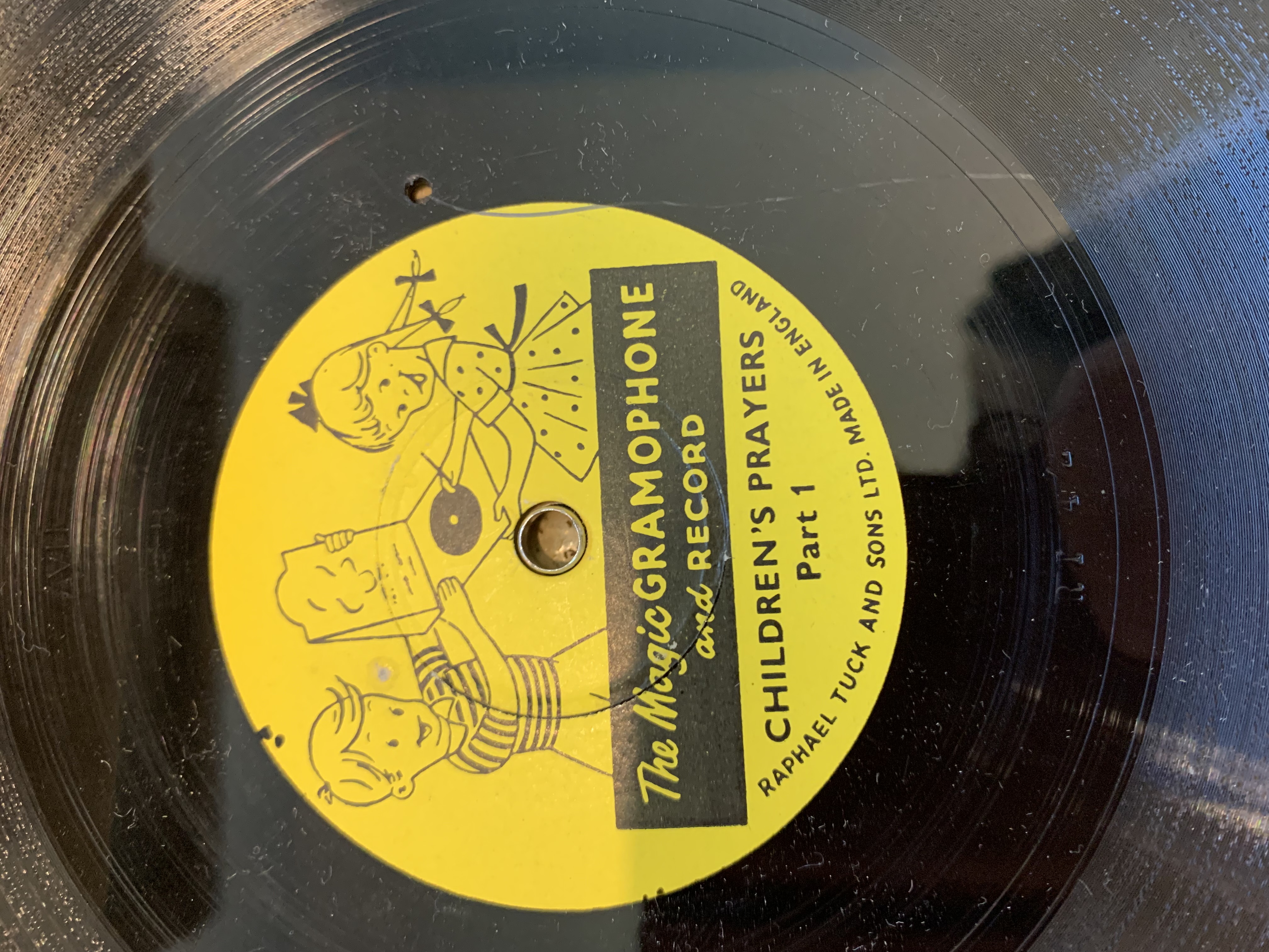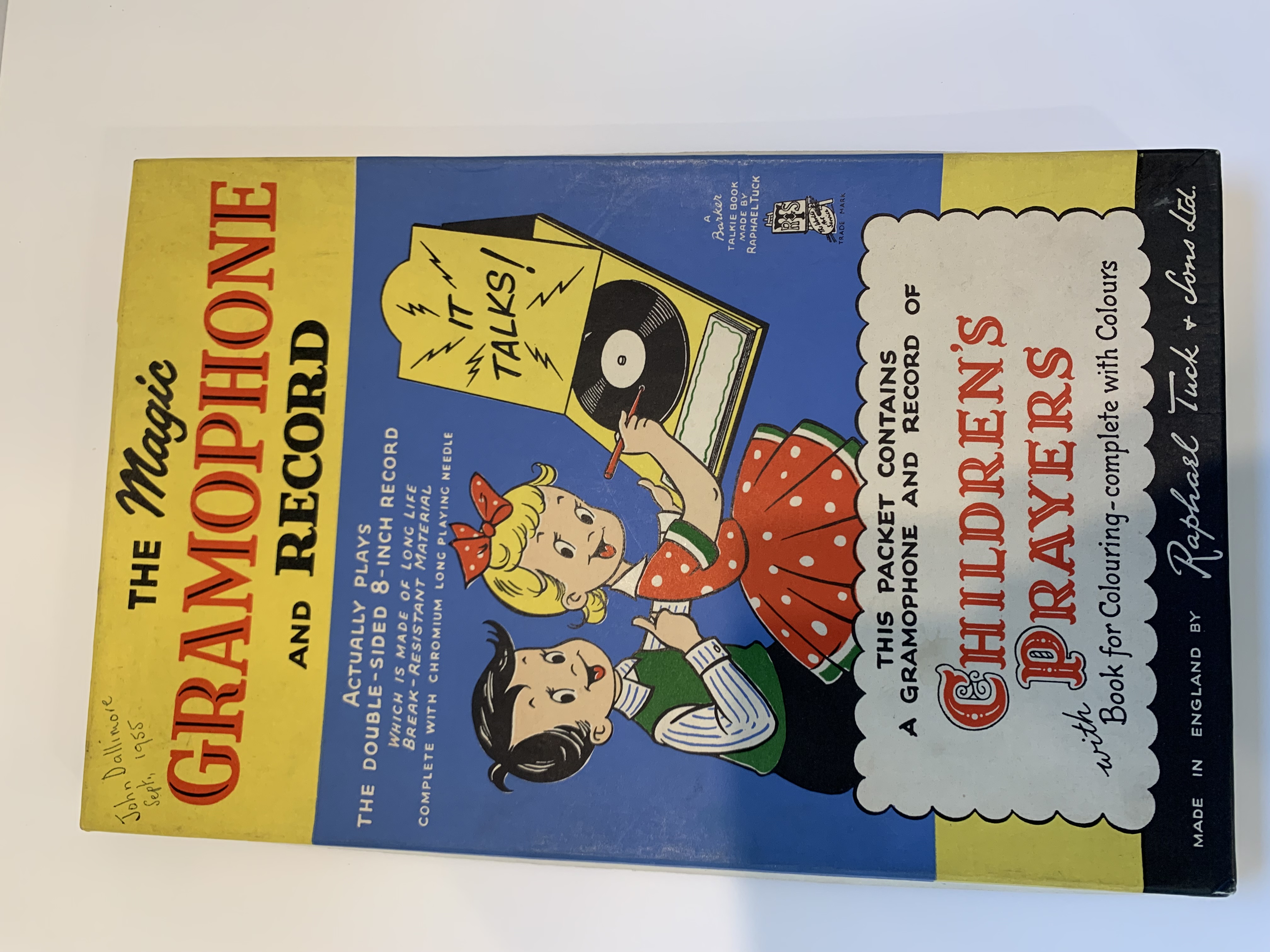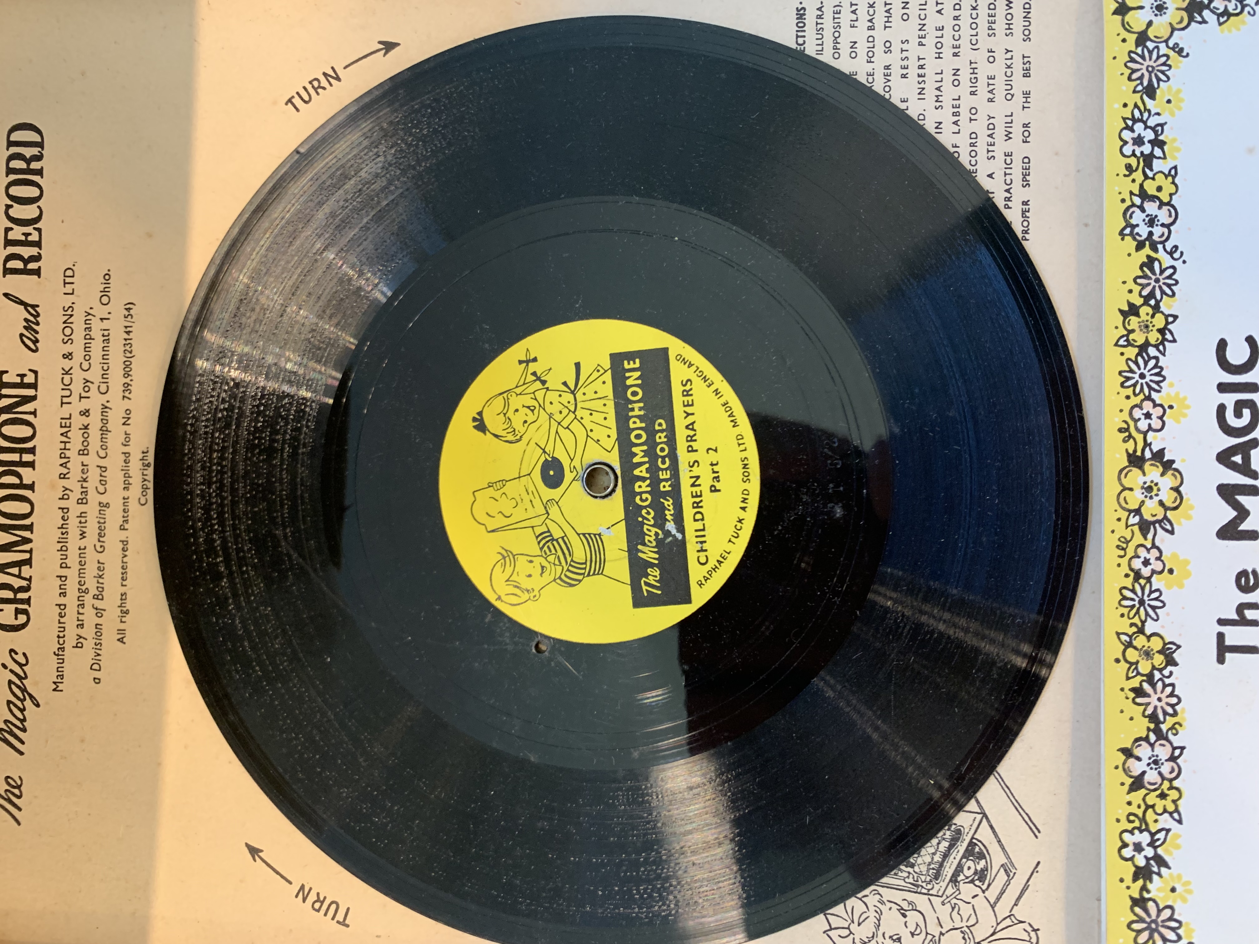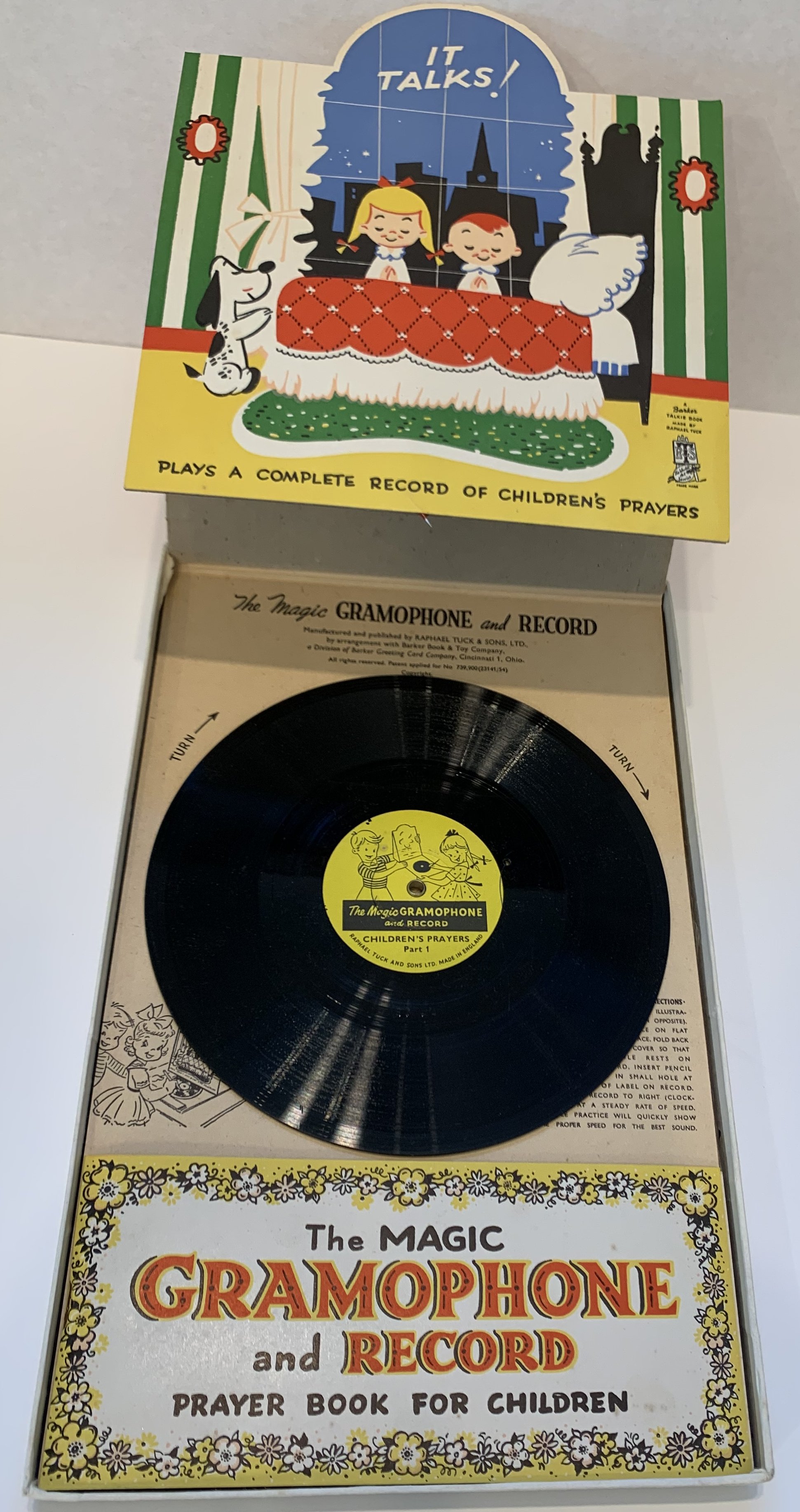 IT TALKS! PLAYS A COMPLETE RECORD OF CHILDREN'S PRAYERS. IT'S FUN, IT'S SO EASY TO DO! This is a rare pre war Raphael Tuck & Son production called The Magic Gramophone and record, in its original box complete with record . The record, which is described in the box as "made of long-life break resistant material " will play by placing the needle, which is incorporated in the cardboard insert, then inserting a pencil in a small hole in the record and spinning the record manually.