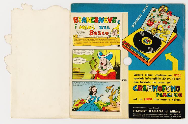 translated to THIS ALBUM CONTAINS A SPECIAL UNBREAKABLE, 20 CM, 78 RPM, DOUBLE-SIDED DISC FOR USE ON THE MAGIC GRAMOPHONE AND A COLOR ILLUSTRATED BOOK.