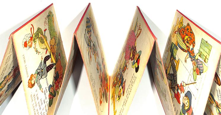 concertina pages of thick board hinged with cloth to fold out rather than pages to turn