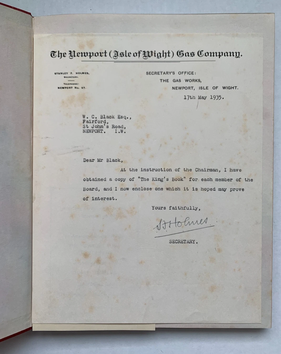 contains a letter and notice from THE NEWPORT (ISLE OF WIGHT) GAS COMPANY that the book is a gift to members on the Board of Directors