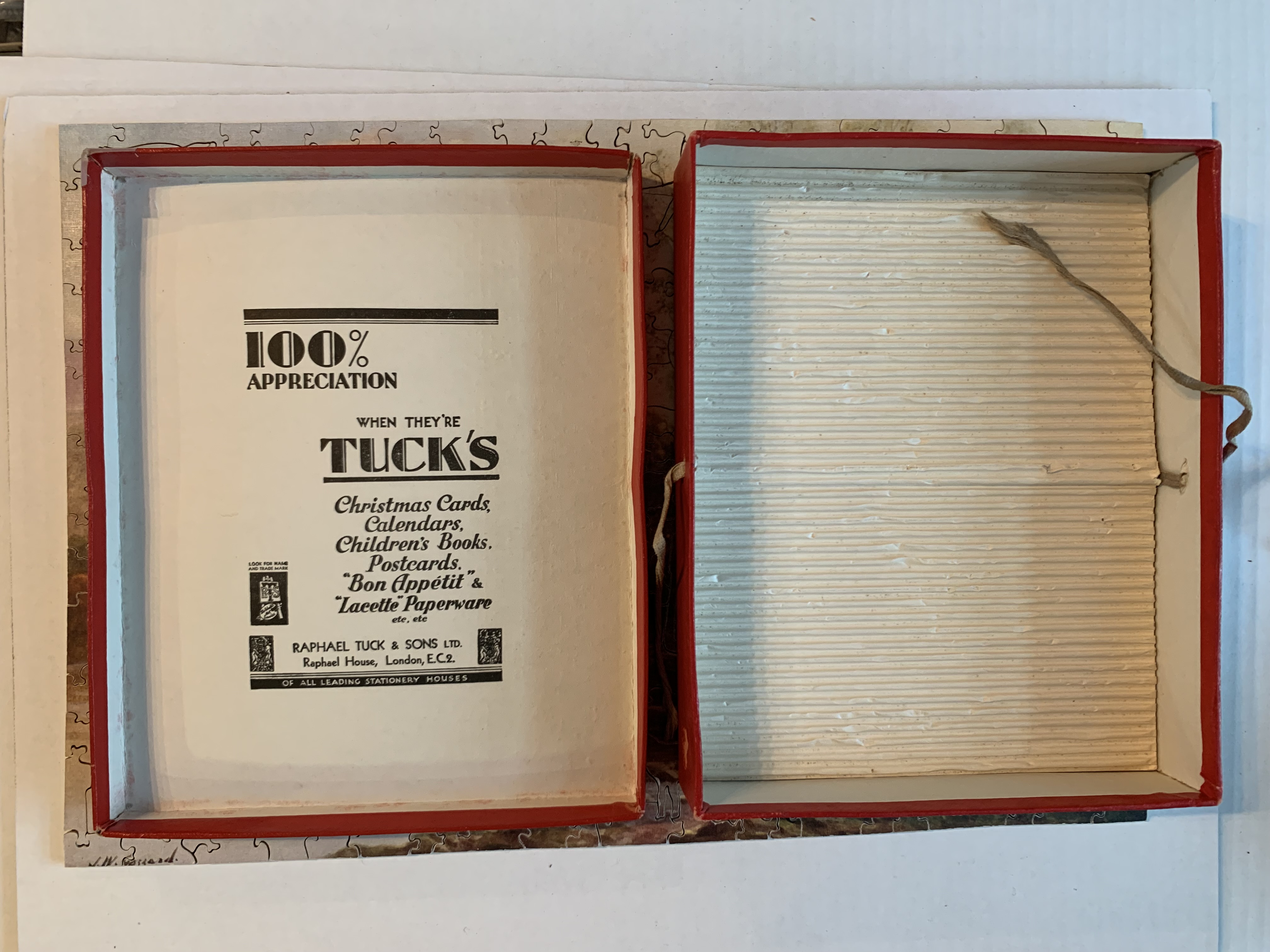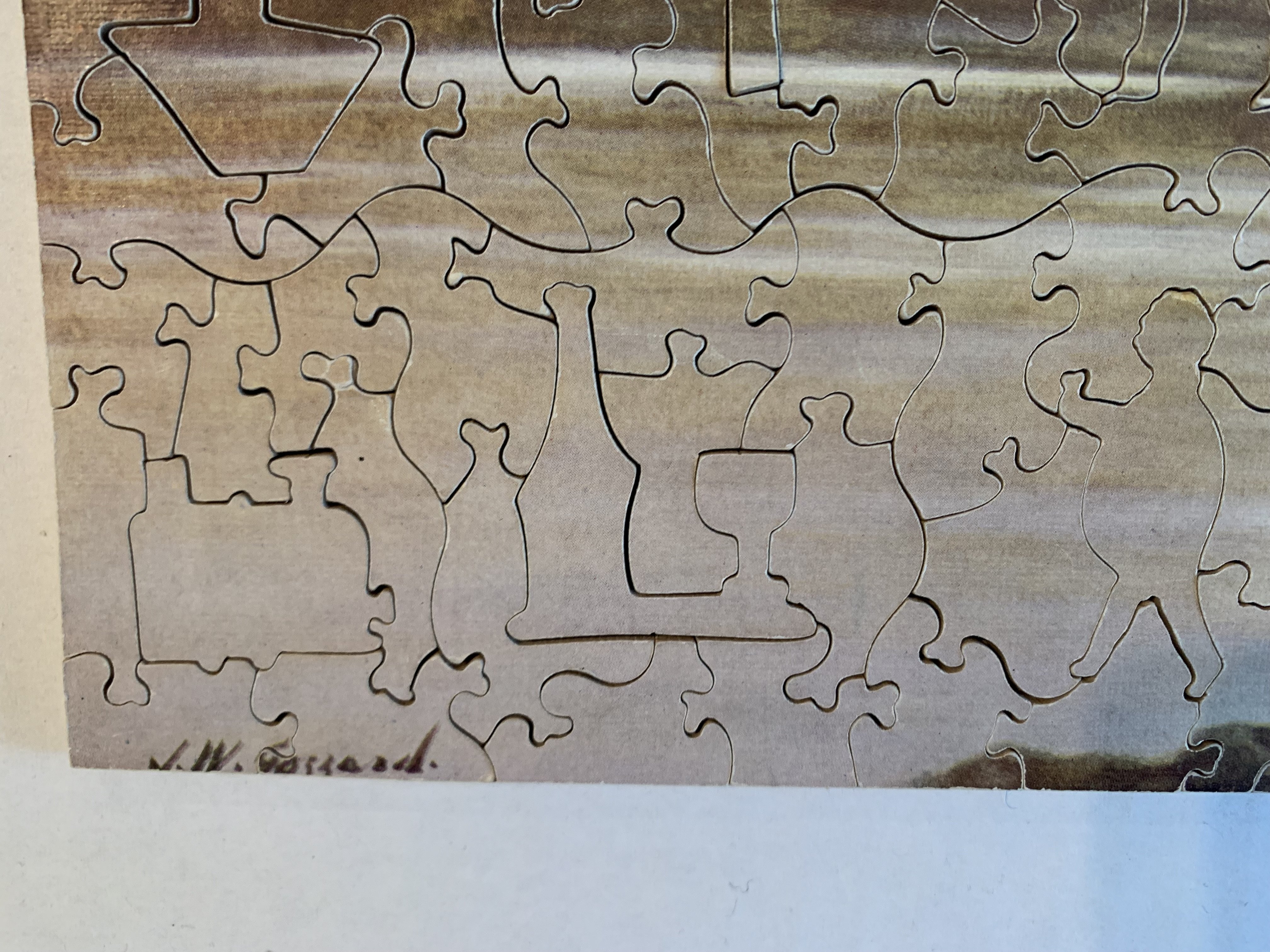 Zag-Zaw line of puzzles was first produced in 1909, most incorporate figurals or whimsies, sold in red, orange, or occasionally green boxes with labels on the side or bottom of the box, most without guide pictures. Initially cut non-interlocking but by 1930's became more so. Puzzles have a different cuts so that the same image will come in several versions which means that missing pieces can not be taken from other puzzles with the same image. The puzzle labels are often hand written and come with minor variations in titles and details. Some have a DESIGN category on the label. From my readings this refers to the style of cut, wavy lines, figurals, etc. See also Bob Armstrong's website on old jigsaw puzzles