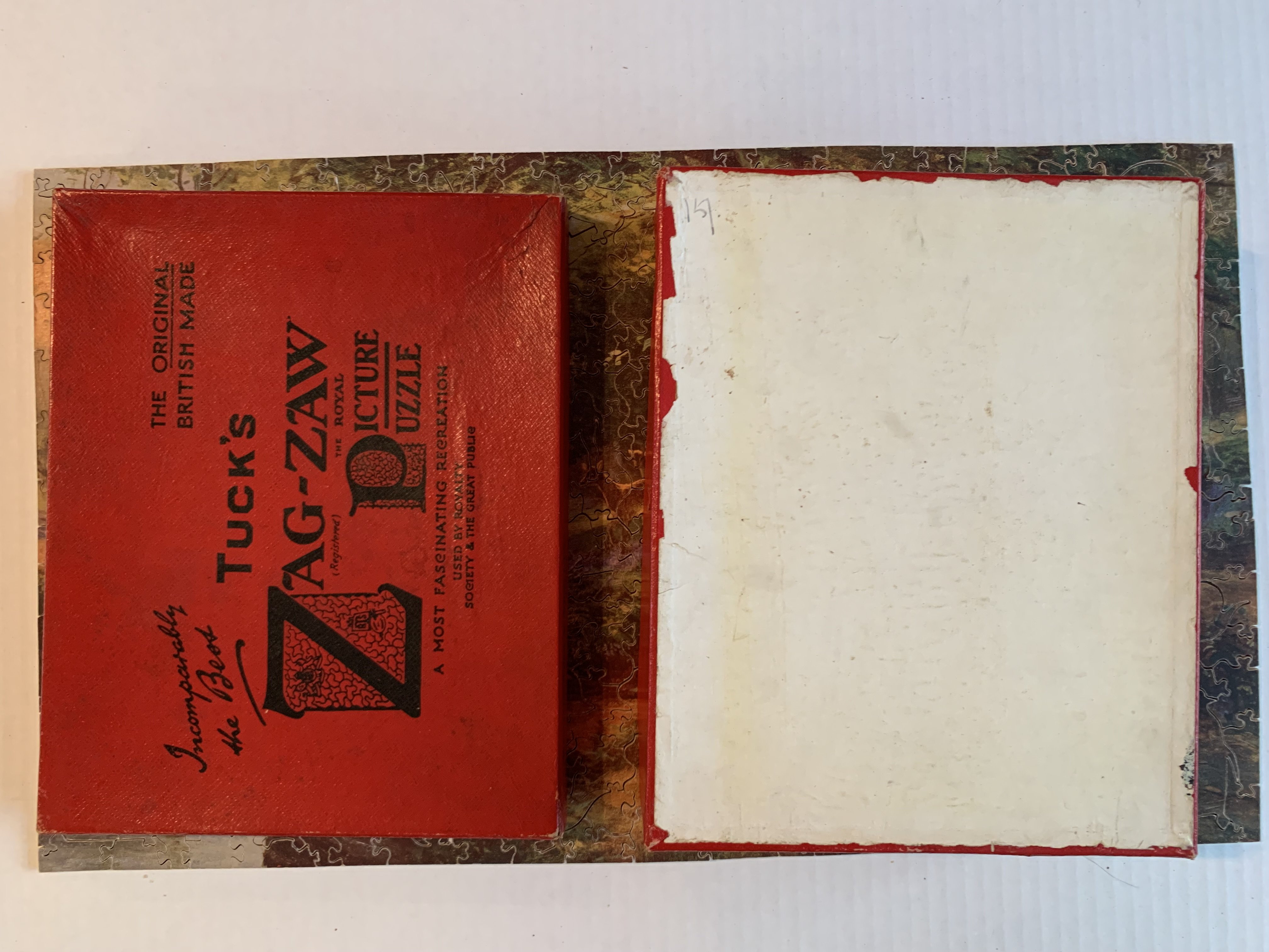 Zag-Zaw line of puzzles was first produced in 1909, most incorporate figurals or whimsies, sold in red, orange, or occasionally green boxes with labels on the side or bottom of the box, most without guide pictures. Initially cut non-interlocking but by 1930's became more so. Puzzles have a different cuts so that the same image will come in several versions which means that missing pieces can not be taken from other puzzles with the same image. The puzzle labels are often hand written and come with minor variations in titles and details. Some have a DESIGN category on the label. From my readings this refers to the style of cut, wavy lines, figurals, etc. See also Bob Armstrong's website on old jigsaw puzzles