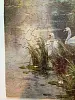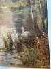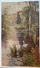 Swans in stream, many large trees, flowers at water's edge.