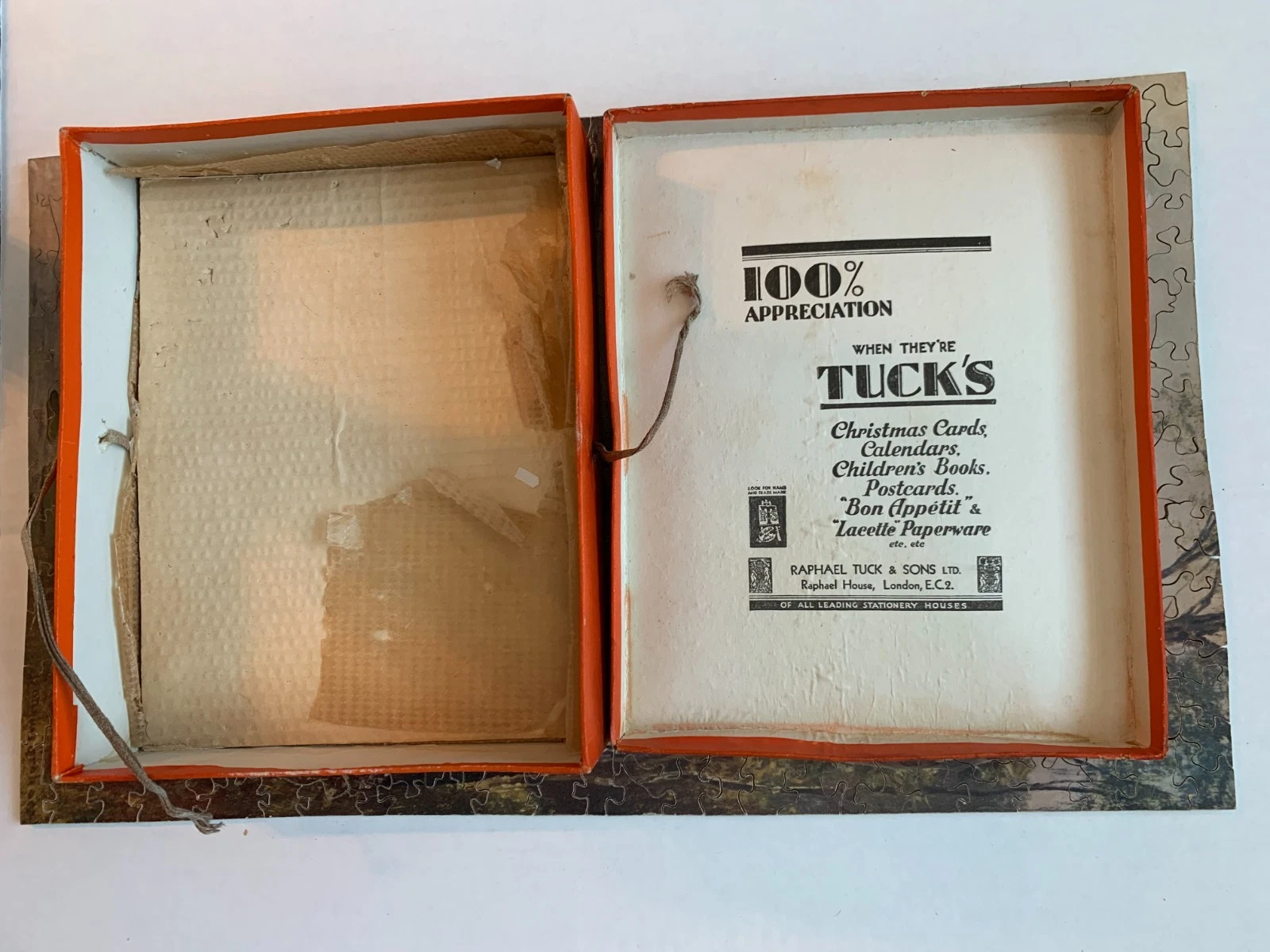 Zag-Zaw line of puzzles was first produced in 1909, most incorporate figurals or whimsies, sold in red, orange, or occasionally green boxes with labels on the side or bottom of the box, most without guide pictures. Initially cut non-interlocking but by 1930's became more so. Puzzles have a different cuts so that the same image will come in several versions which means that missing pieces can not be taken from other puzzles with the same image. The puzzle labels are often hand written and come with minor variations in titles and details. Some have a DESIGN category on the label. From my readings this refers to the style of cut, wavy lines, figurals, etc. See also Bob Armstrong's website on old jigsaw puzzles
