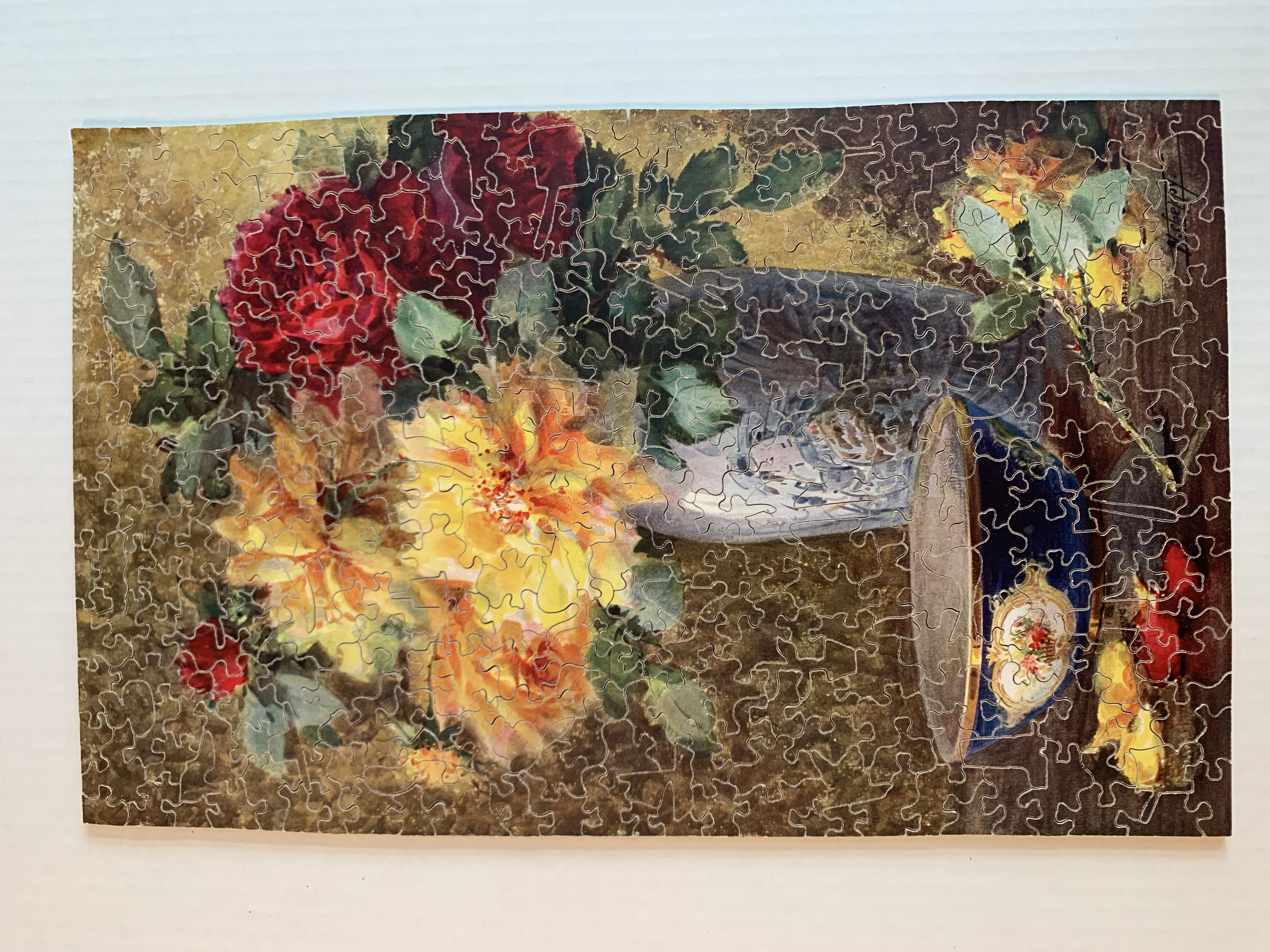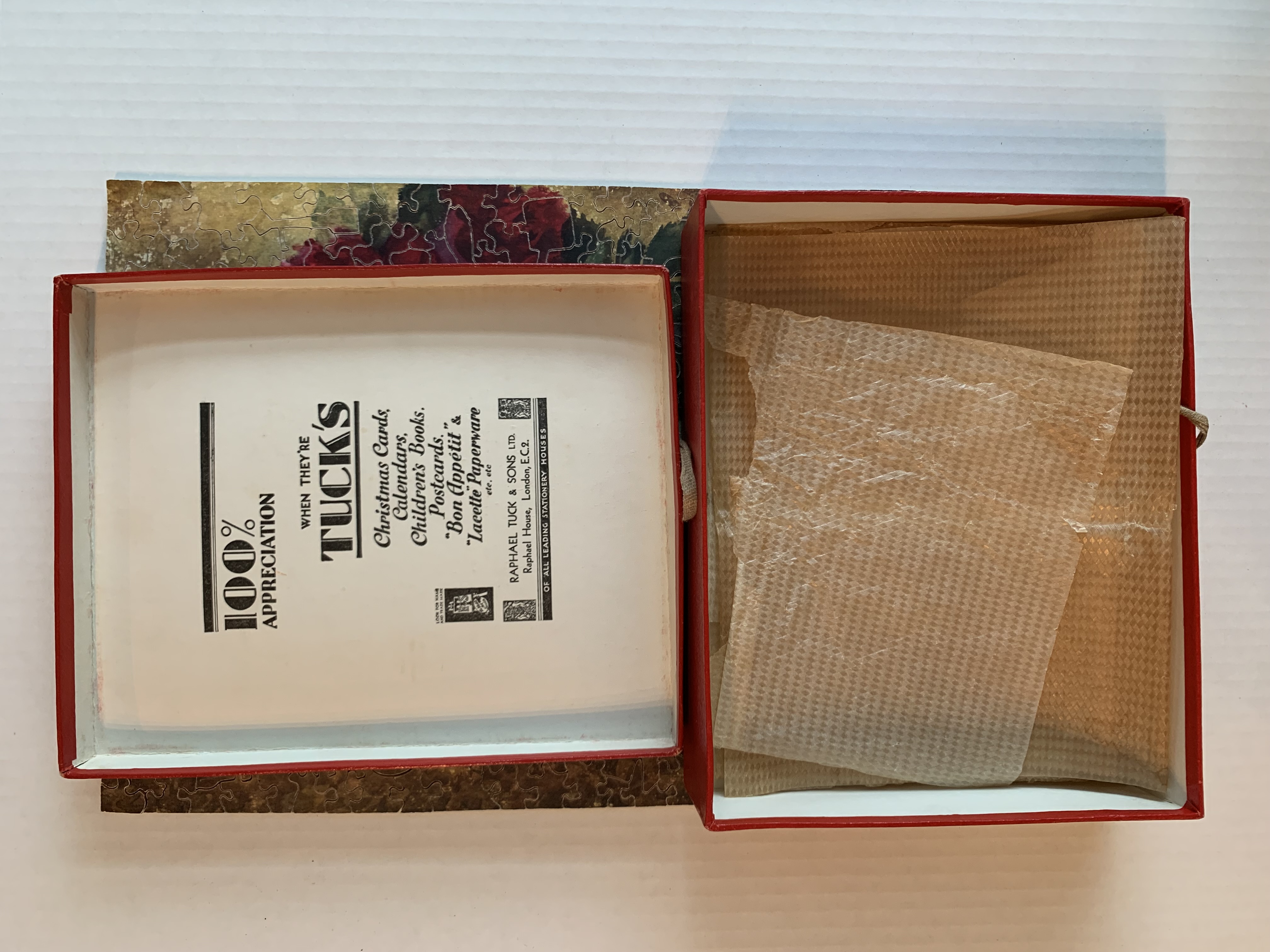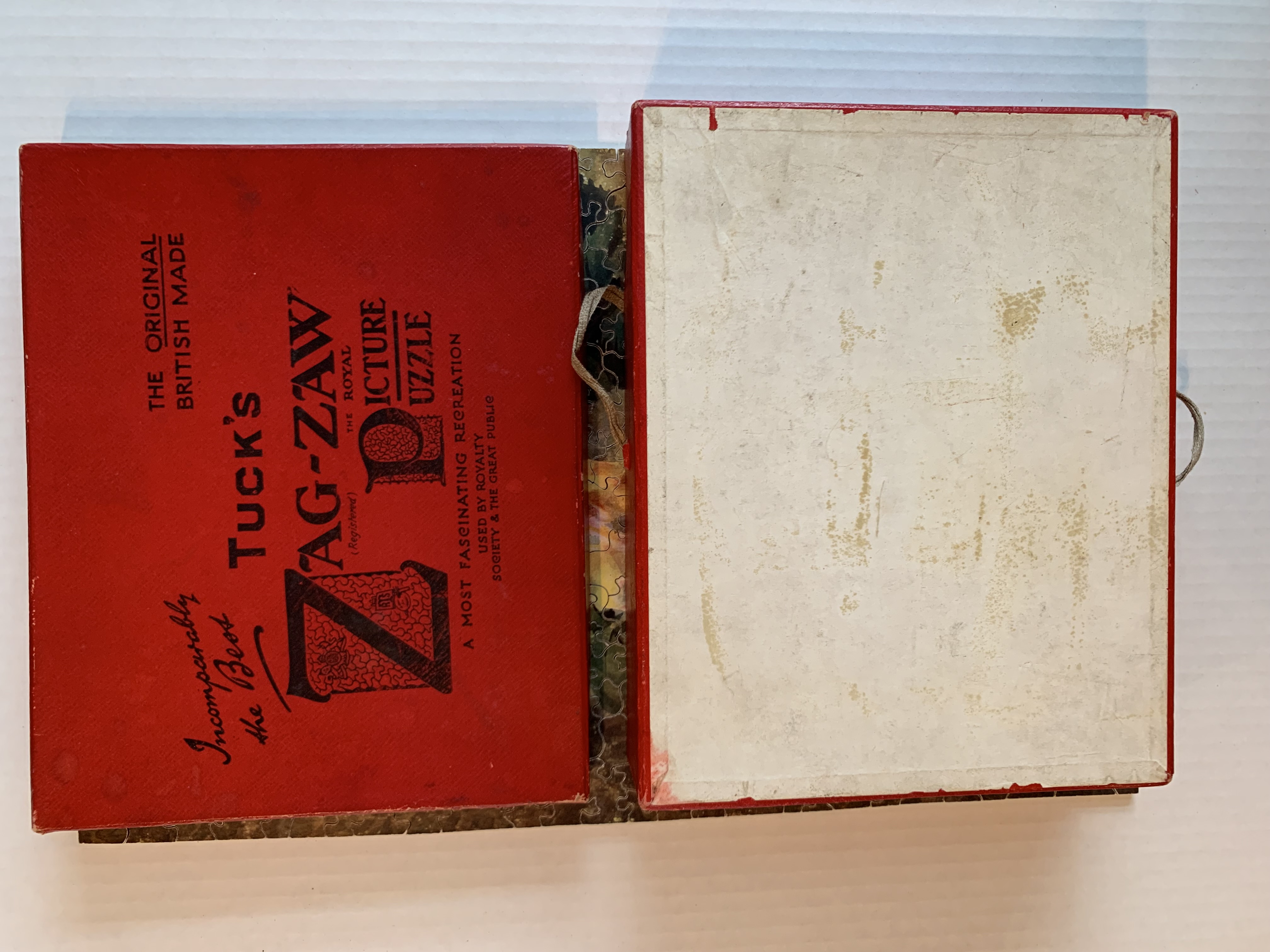 Zag-Zaw line of puzzles was first produced in 1909, most incorporate figurals or whimsies, sold in red, orange, or occasionally green boxes with labels on the side or bottom of the box, most without guide pictures. Initially cut non-interlocking but by 1930's became more so. Puzzles have a different cuts so that the same image will come in several versions which means that missing pieces can not be taken from other puzzles with the same image. The puzzle labels are often hand written and come with minor variations in titles and details. Some have a DESIGN category on the label. From my readings this refers to the style of cut, wavy lines, figurals, etc. See also Bob Armstrong's website on old jigsaw puzzles