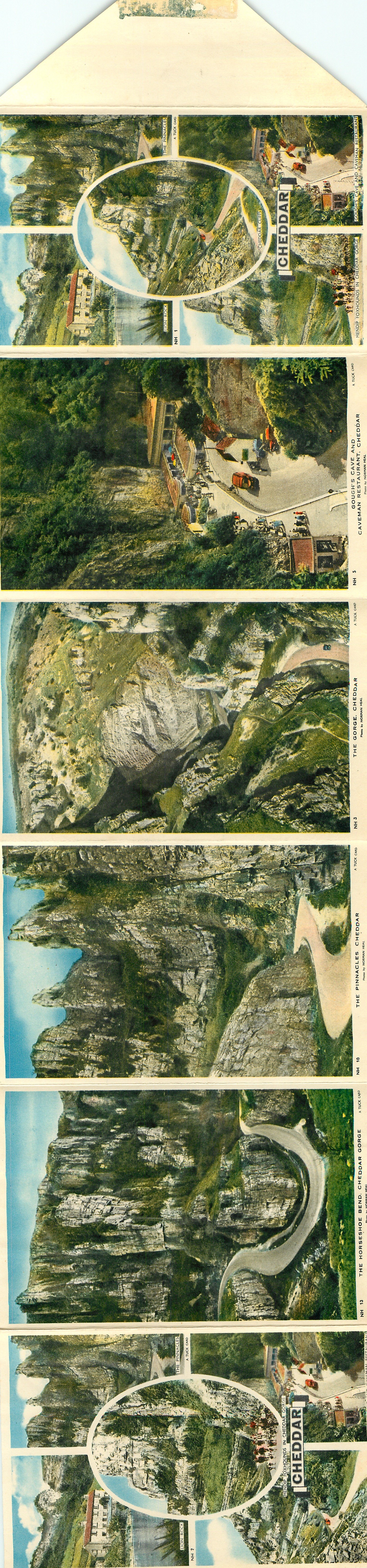 same images and numbers with slight differences in card titles in postcard NH 1, 2, 5 5 inserts LION ROCK, MENDIP FOXHOUNDS IN CHEDDAR GORGE, THE PINNACLES, GOUGH'S CAVE AND CAVEMAN RESTAURANT, CHEDDAR CLIFFS, GOUGH'S CAVE AND CAVEMAN'S RESTAURANT CHEDDAR, THE GORGE CHEDDAR, THE PINNACLES CHEDDAR, THE HORSESHOE BEND CHEDDAR GORGE, 5 insert LION ROCK, CHEDDAR CLIFFS, THE PINNACLES, GOUGH'S CAVE AND CAVEMAN RESTAURANT, MENDIP FOXHOUNDS IN CHEDDAR GORGE