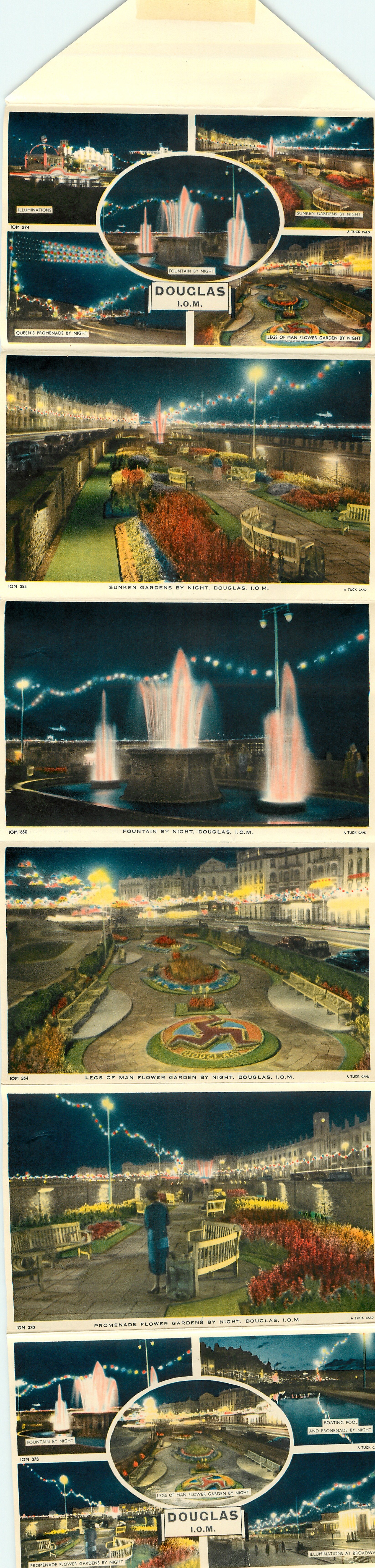 comes with LETTERVIEW "C" on envelope fold same images and numbers with slight differences in card titles in postcard IOM 350, 354, 355, 373, 374, 370 5 inserts ILLUMINATIONS, QUEEN'S PROMENADE BY NIGHT, SUNKEN GARDENS BY NIGHT, LEGS OF MAN FLOWER GARDEN BY NIGHT, FOUNTAIN BY NIGHT, SUNKEN GARDENS BY NIGHT, FOUNTAIN BY NIGHT, LEGS OF MAN FLOWER GARDEN BY NIGHT, PROMENADE FLOWER GARDENS BY NIGHT, 5 inserts FOUNTAIN BY NIGHT, PROMENADE FLOWER GARDENS BY NIGHT, BOATING POOL AND PROMENADE BY NIGHT, ILLUMINATIONS AT BROADWAY, LEGS OF MAN FLOWER GARDEN BY NIGHT IOM 350, 354, 355, 370, 373, 374 same images as Tuck postcards I.O.M., chrome IOM 350, 354, 355, 370, 373, 374 IOM 350, 354, 355, 370 same images as Tuck postcards GRAND SOUVENIR OF DOUGLAS ISLE OF MAN IOM 350, 354, 355, 370