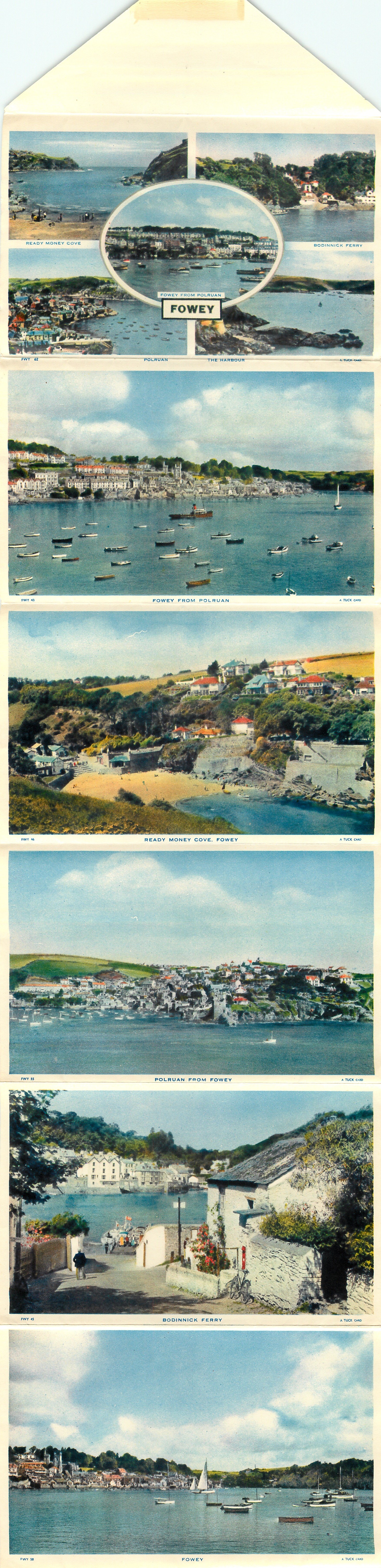 same images and numbers with slight differences in card titles in postcard FWY 45, 46, 55, 62 5 inserts READY MONEY COVE, POLRUAN, BODINNICK FERRY, THE HARBOUR, FOWEY FROM POLRUAN, FOWEY FROM POLRUAN, READY MONEY COVE FOWEY, POLRUAN FROM FOWEY, BODINNICK FERRY, FOWEY FWY 43, 46, 58, same images as Tuck postcards FOWEY, REAL PHOTOGRAPH FWY 43, 46, 58