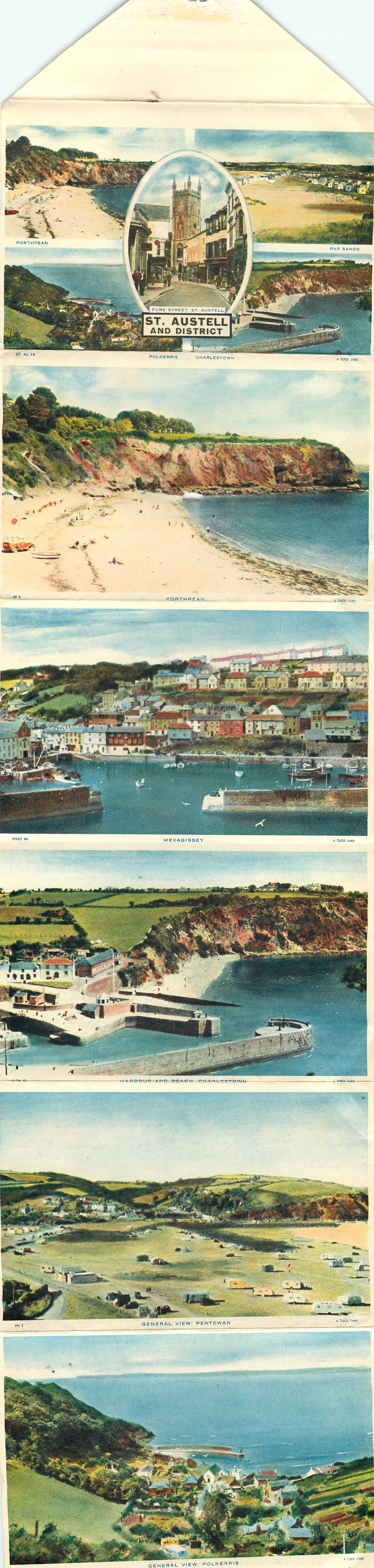 comes with multiple prefixes, same images and numbers with slight differences in card titles in postcard ST. AL 14, PP9, CLTN 10, PK 3 ST. AL 14 5 inserts PORTPEAN, POLKERRIS, PAR SANDS, CHARLESTOWN, FORE STREET, ST. AUSTELL, PR 9 PORTHPEAN, MVGY 64 MEVAGISSEY, CTLN 10 HARBOUR AND BEACH CHARLESTOWN, PN 2 GEENRAL VIEW PENTEWAN, PK 3 GENERAL VIEW POLKERRIS ST. AUSTELL AND DISTRICT CLTN 10 same images as Tuck postcards CHARLESTOWN CLTN 10 ST. AUSTELL AND DISTRICT PN 2 same images as Tuck postcards PENTEWAN PN 2 ST. AUSTELL AND DISTRICT PK 3 same images as Tuck postcards POLKERRIS, coloured chrome PK 3