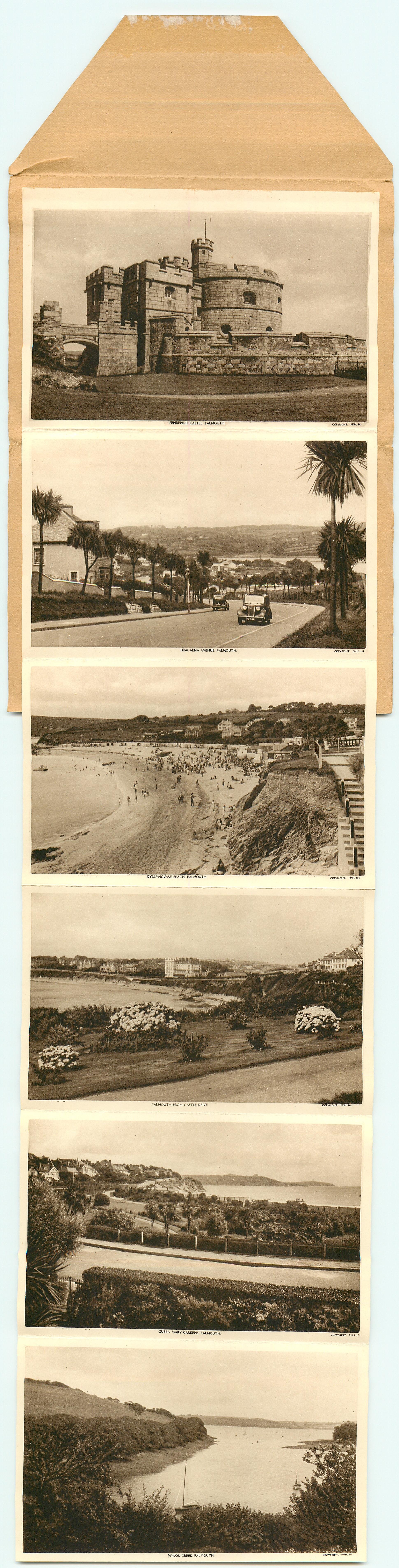 comes with IF SENDER'S SIGNATURE IS WRITTEN ONLY AND FLAP TUCKED IN 1/2D. STAMP IS REQUIRED. IF MESSAGE IS WRITTEN AND THE GUMMED FLAP SEALED. LETTER POSTAGE IS CHARGED on fold PENDENNIS CASTLE, DRACAENA AVENUE, GYLLYNGVASE BEACH, FALMOUTH FROM CASTLE, QUEEN MARY GARDENS, MYLOR CREEK FMH 145 same images as Tuck postcards FALMOUTH, sepia, comes hand-coloured FMH 145 FMH 164 same images as Tuck postcards FALMOUTH, sepia, comes hand-coloured FMH 164 FMH 168 same images as Tuck postcards FALMOUTH, sepia, comes hand-coloured FMH 168 FMH 179 same images as Tuck postcards FALMOUTH, sepia, comes hand-coloured FMH 179
