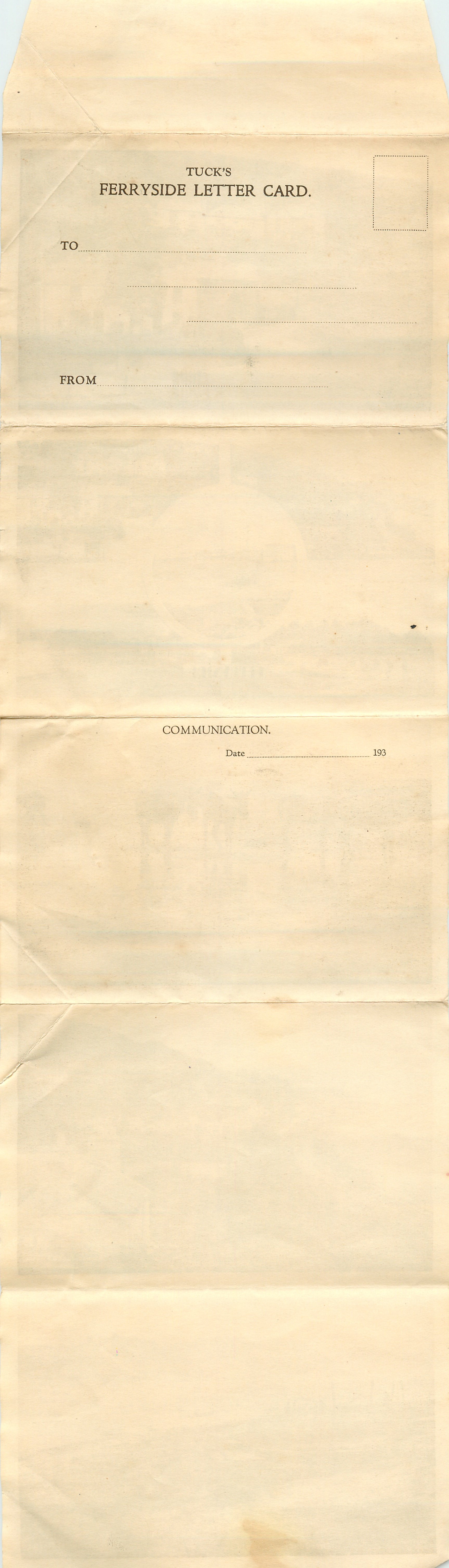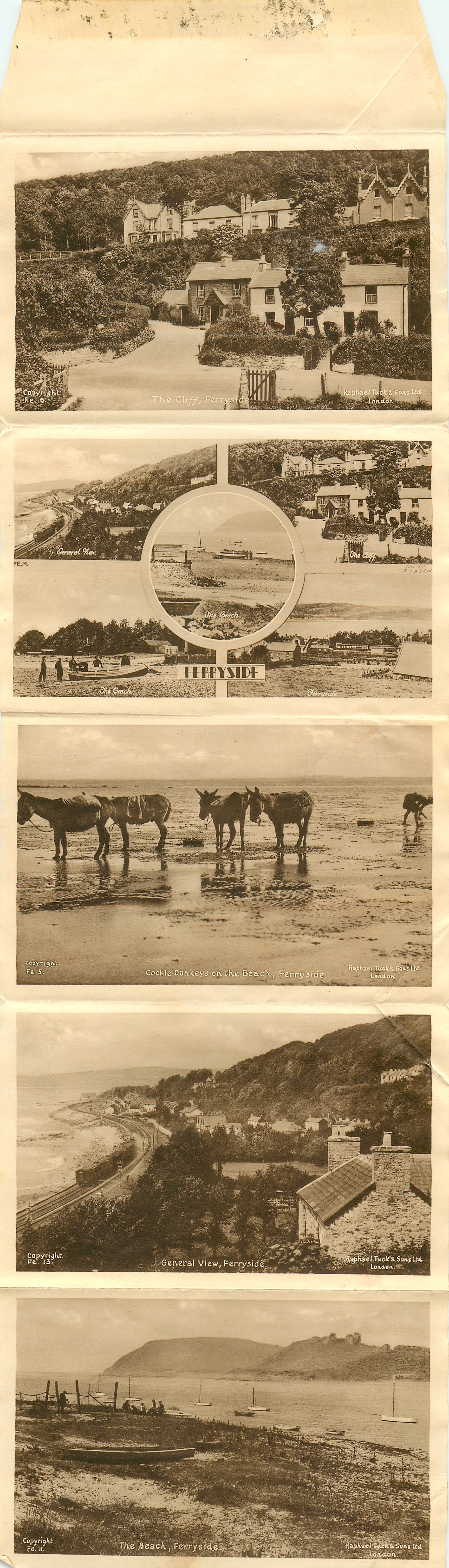 comes with COMMUNICATON on fold, same images and numbers with slight differences in card titles in postcard FE 6, 11, 13, 14 THE CLIFF, 5 insert GENERAL VIEW, THE BEACH, THE BEACH, THE CLIFF, FERRYSIDE, COCKLE DONKEYS ON THE BEACH, GENERAL VIEW, THE BEACH FE 13 same images as Tuck postcards FERRYSIDE, black & grey FE 13
