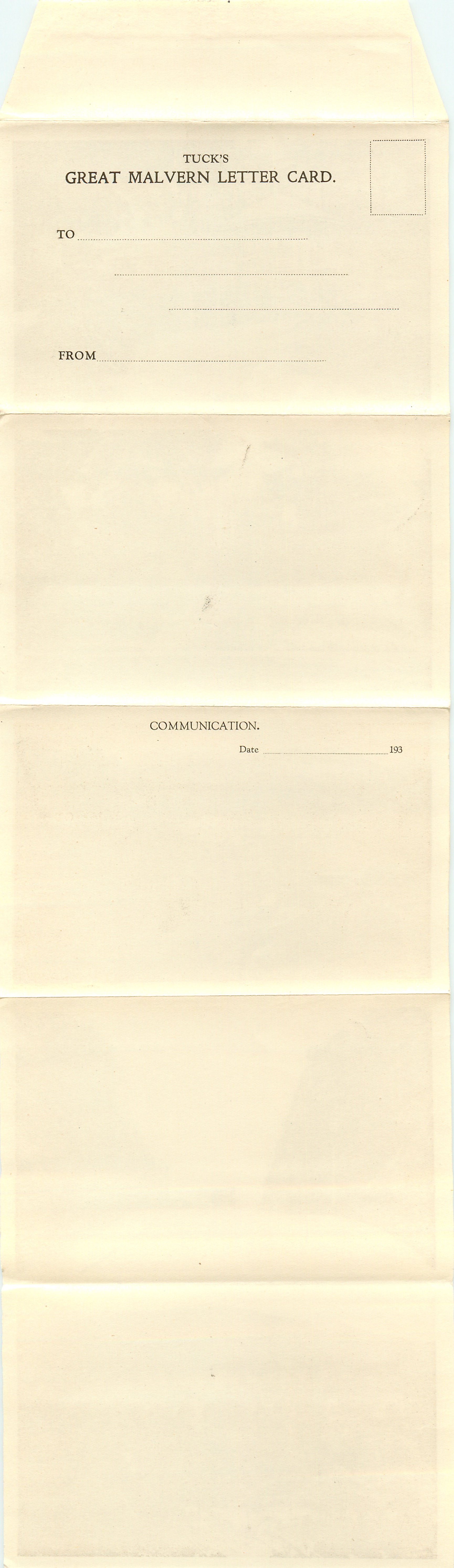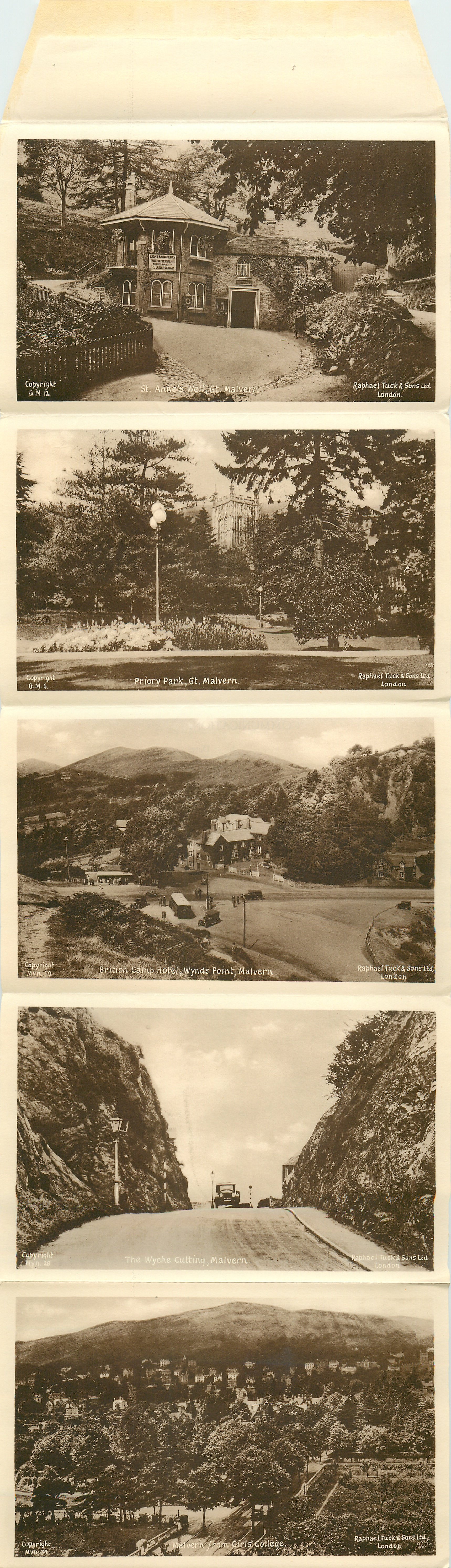 comes with COMMUNICATON on fold ST. ANNE'S WELL, GT. MALVERN, PRIORY PARK, GT. MALVERN, BRITISH CAMP HOTEL, WYNDS POINT, MALVERN, THE WYCHE CUTTING, MALVERN, MALVERN FROM GIRLS' COLLEGE GM 6 same images as Tuck postcards GREAT MALVERN, sepia comes hand-coloured GM 6 GM 12 same images as Tuck postcards GREAT MALVERN, REAL PHOTOGRAPH GM 12 MVN 50 same images as Tuck postcards MALVERN MW 50