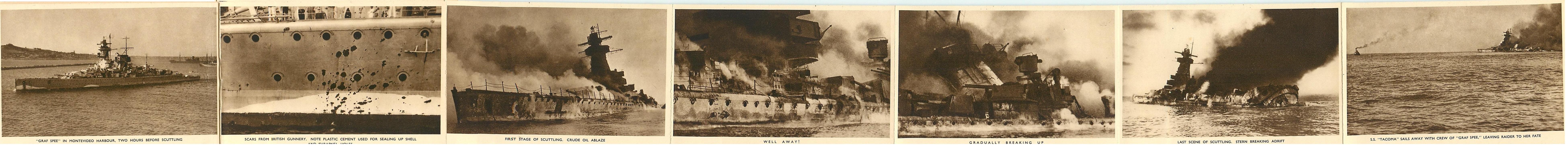 similar images but grouped as insert in Tuck postcards The Royal Navy unnumbered THE BATTLE OF THE RIVER PLATE "GRAF SPEE" IN MONTEVIDEO HARBOUR, TWO HOURS BEFORE SCUTTLING, SCARS FROM BRITISH GUNNERY. NOT PLASTIC CEMENT USED FOR SEALING UP SHELL AND SHRAPNEL HOLES, FIRST STAGE OF SCUTTLING. CRUDE OIL ABLAZE, WELL AWAY!, GRADUALLY BREAKING UP, LAST SCENE OF SCUTTLING. STERN BREAKING ADRIFT, S.S. "TACOMA" SAILS AWAY WITH CREW OF "GRAF SPEE," LEAVING RAIDER TO HER FATE