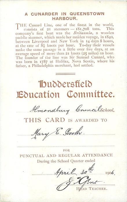 reward cards, postcard images for HUDDERSFIELD EDUCATION COMMITTEE
