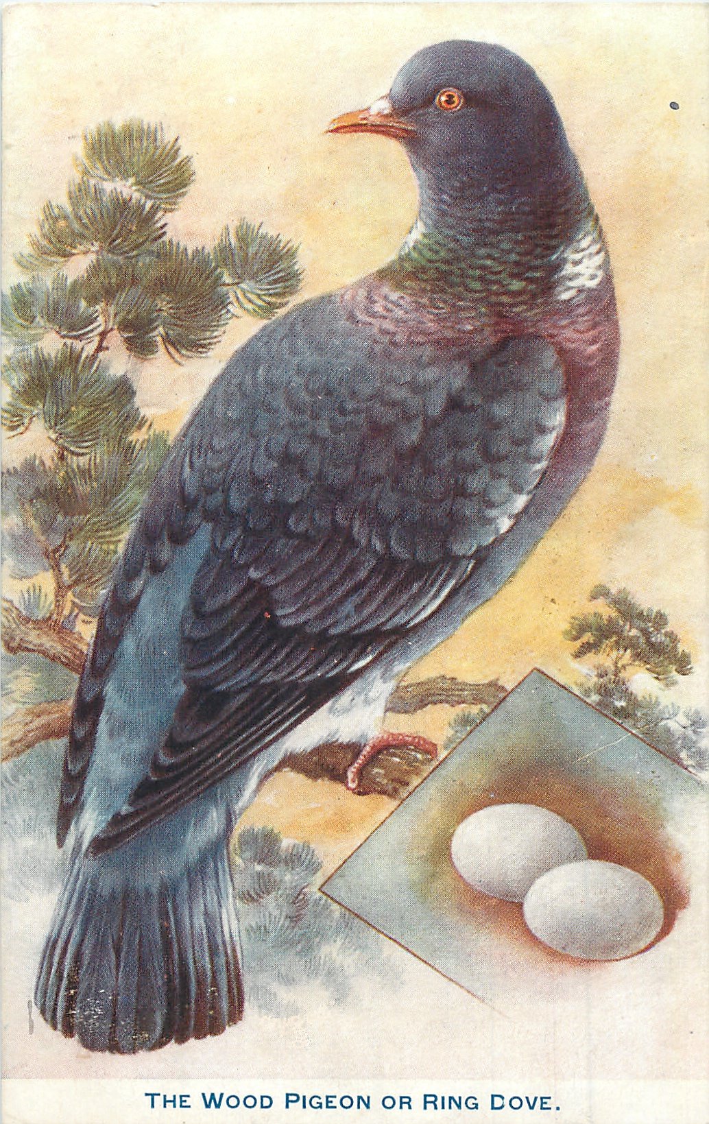 back:- THE WOOD PIGEON OR RING DOVE IS FAMILIAR TO MOST OF US. AT CERTAIN PERIODS IN THE WINTER AND SPRING IT VISITS GREAT BRITAIN IN SUCH VAST NUMBERS//EVEN BY STRANGERS same image & card title AQUARETTE 9218 BRITISH BIRDS AND THEIR EGGS
