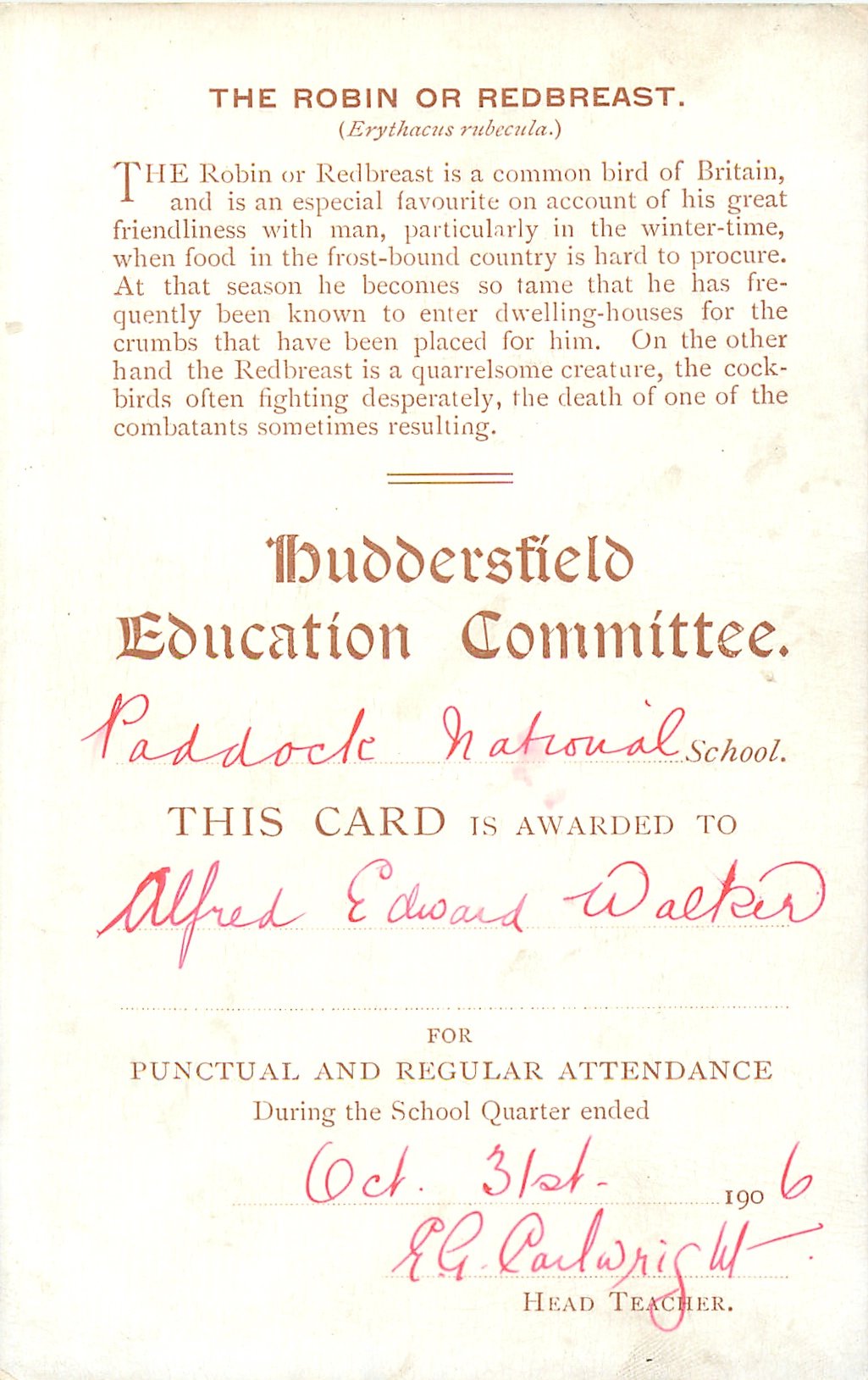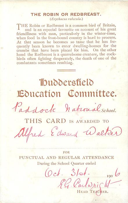 back:- THE ROBIN OR REDBREAST IS A COMMON BIRD OF BRITAIN, AND IS AN ESPECIAL FAVOURITE ON ACCOUNT OF HIS GREAT FRIENDLINESS WITH MAN, PARTICULARLY IN THE WINTER-TIME//RESULTING OILETTE on front, same image & card title OILETTE 9169 BIRDS AND BLOSSOMS