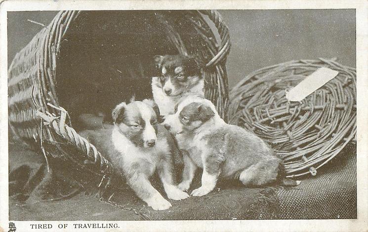 back:- THEY ARE TIRED OF TRAVELLING THESE THREE LITTLE PUPPIES. THEY HAVE EVIDENTLY COME A LOG WAY, PASKED IN THE HAMPER, AND NOW THE LID IS OFF//LIKE TO TAKE ONE HOME FOR YOURSELF this image & card title GLOSSO 5588