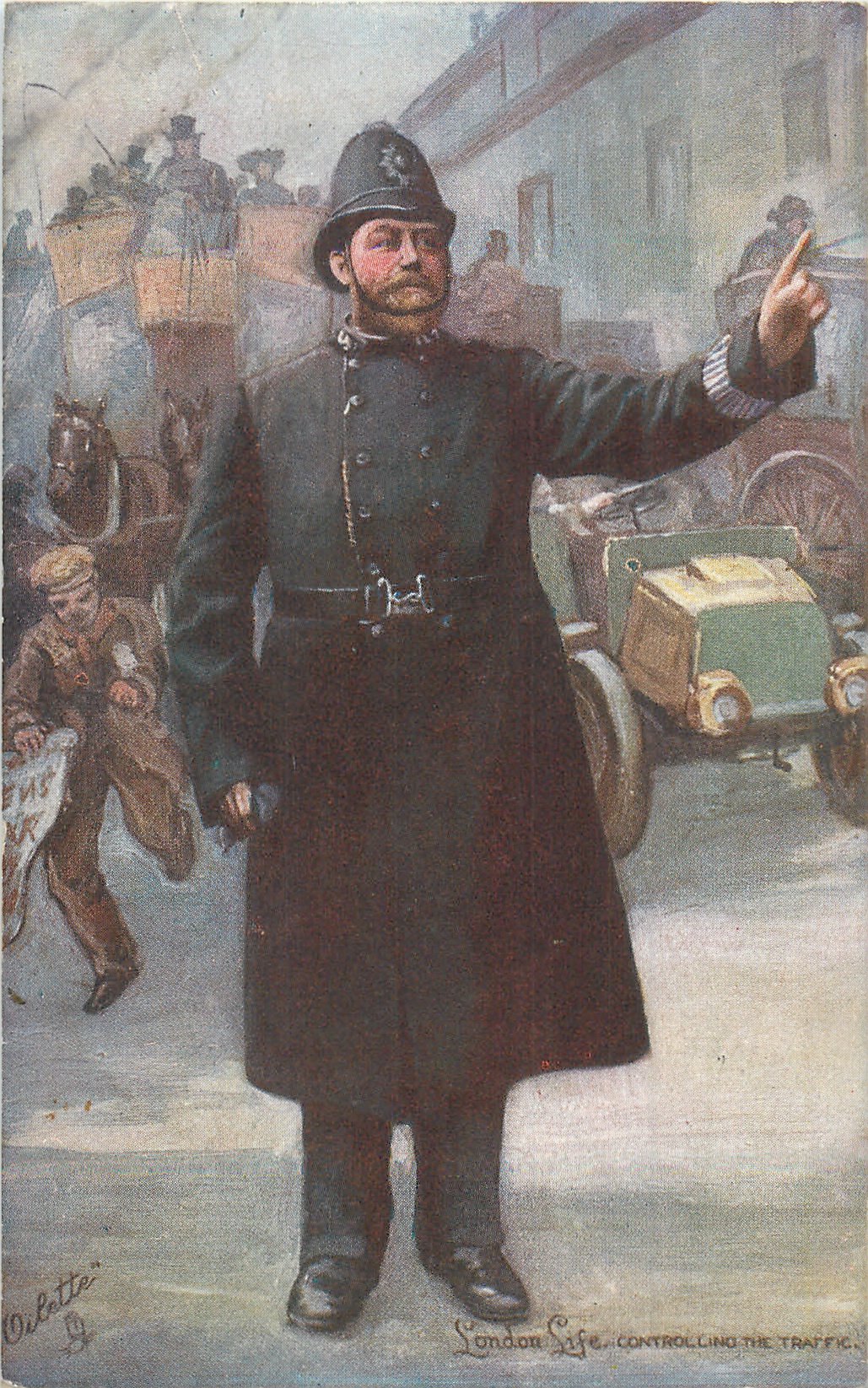 back:- AT ALL THE CHIEF POINTS IN LONDON WHERE THE TRAFFIC IS AT ITS GREATEST THE POLICEMAN IS TO BE FOUND STANDING IN THE MIDDLE OF THE ROAD GIVING HIS DIRECTIONS, HE HARDLY EVER HAS TO RAISE HIS VOICE//POSSESSING SO PERFECT PERFECT A SYSTEM OF STREET REGULATION front OILETTE, this image in OILETTE 9015 LONDON LIFE