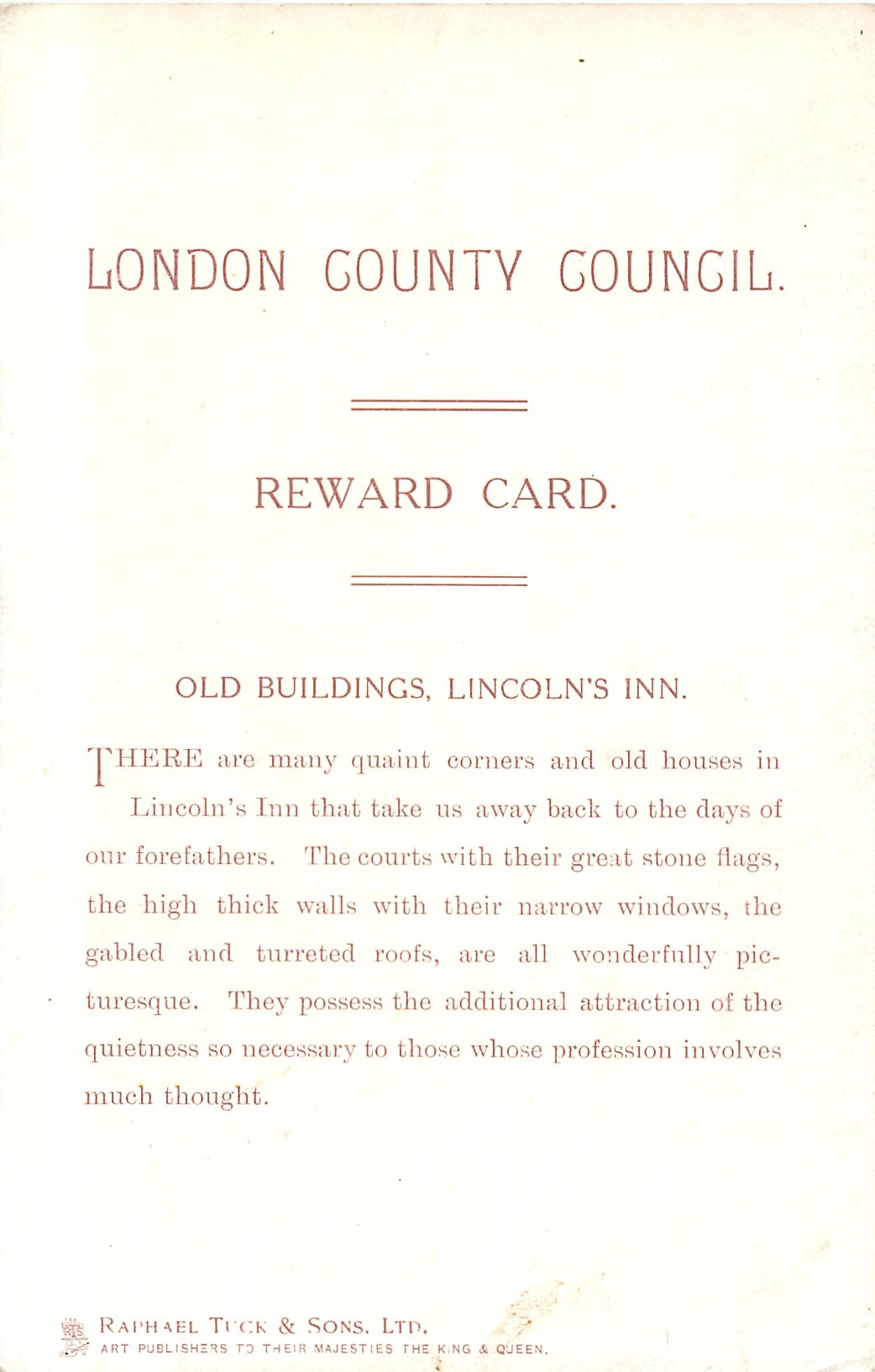 as these cards use postcard images the set is also listed in TuckDBpostcards back Tuck logo at base with RAPHAEL TUCK & SONS, LTD. ART PUBLISHERS TO THEIR MAJESTIES THE KING & QUEEN, same images & card titles OILETTE 1537 & 1538 INNS OF COURT AND CHANCERY
