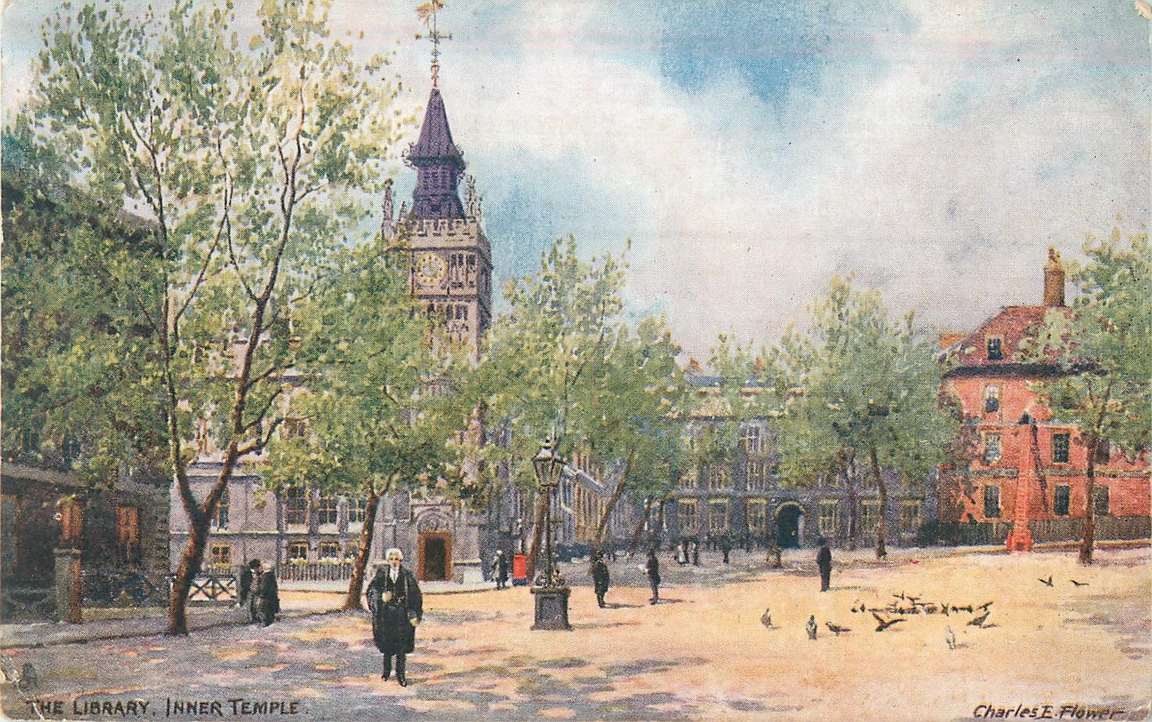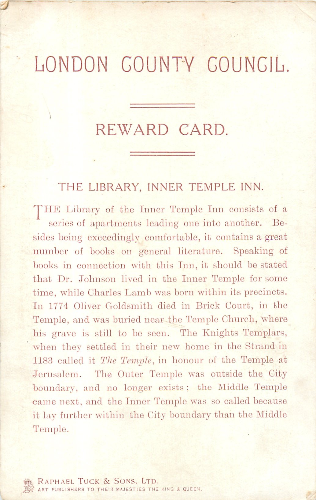back:- THE LIBRARY OF THE INNER TEMPLE CONSISTS OF A SERIES OF APARTMENTS LEADING ONE INTO ANOTHER. BESIDES BEING EXCEEDINGLY COMFORTABLE IT CONTAINS A GREAT NUMBER OF BOOKS ON GENERAL LITERATURE.//CITY BOUNDARY THAN THE MIDDLE TEMPLE