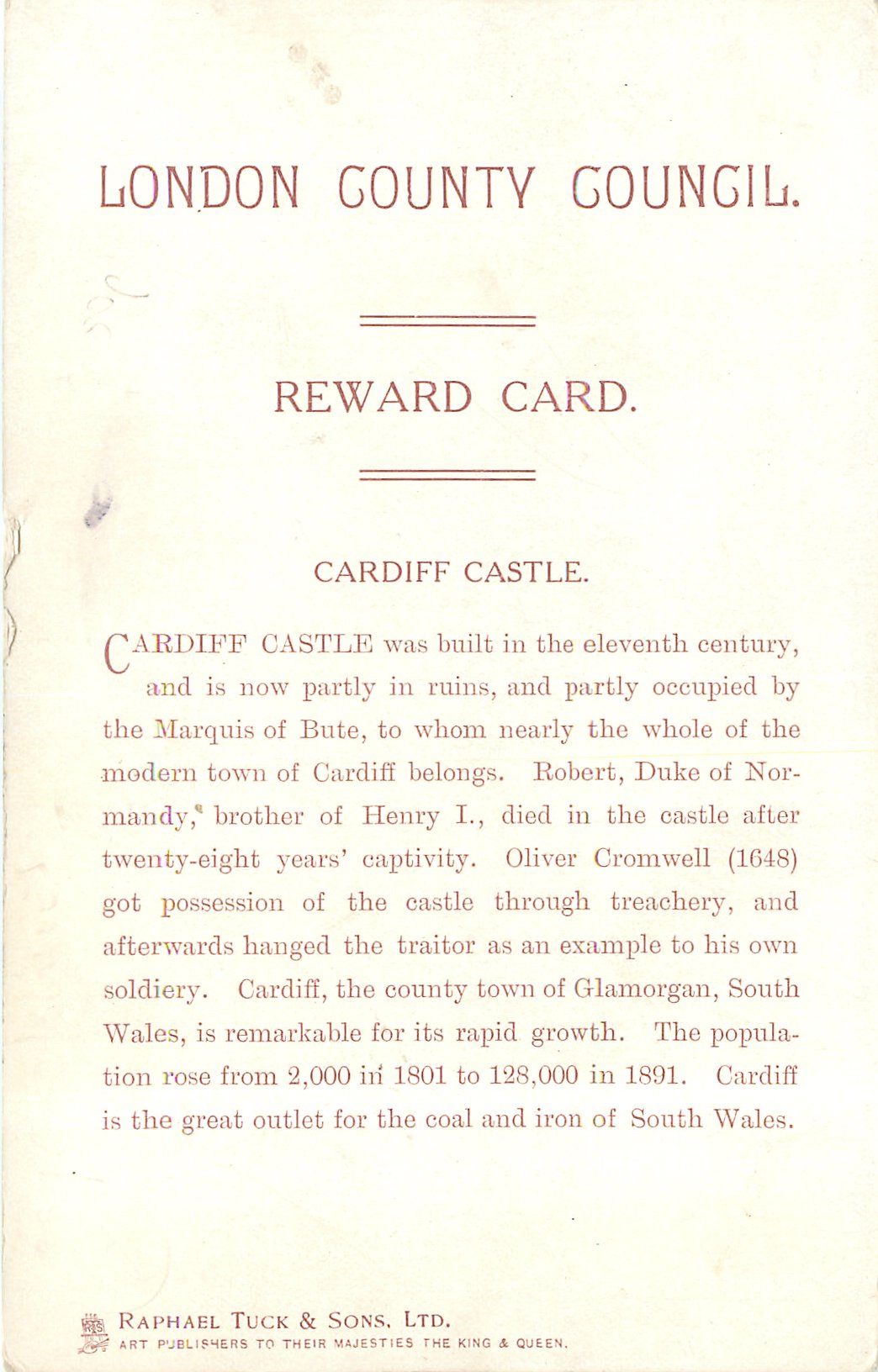 back:- WAS BUILT IN THE ELEVENTH CENTURY, AND IS NOW PARTLY IN RUINS, AND PARTLY OCCUPIED BY THE MARQUIS OF BUTE TO WHOM NEARLY THE WHOLE OF THE MODERN TOWN//IRON OF SOUTH WALES same image 1440
