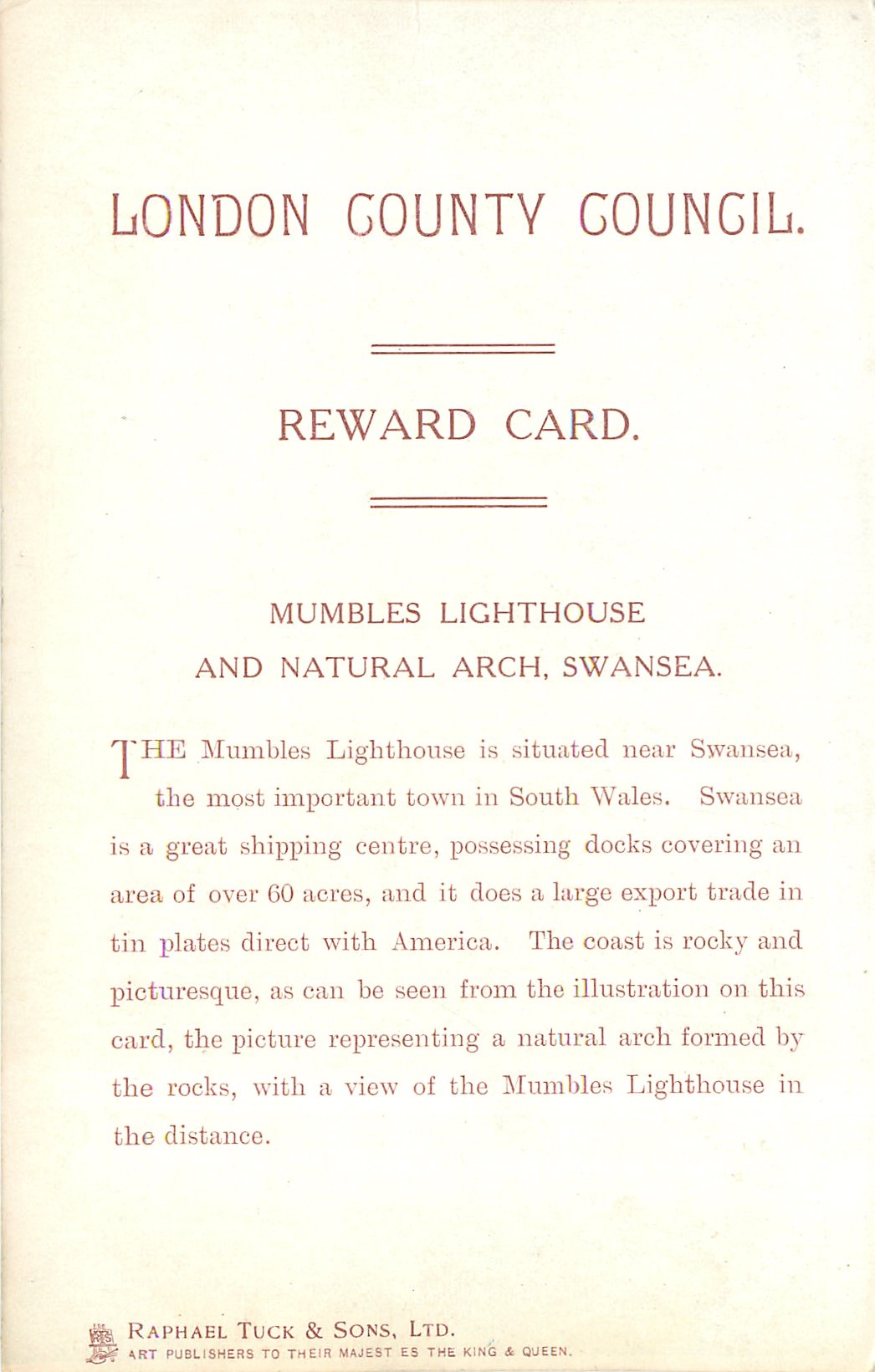 back:- THE MUMBLES LIGHTHOUSE IS SITUATED NEAR SWANSEA, THE MOST IMPORTANT TOWN IN SOUTH WALES. SWANSEA IS A GREAT SHIPPING CENTRE//MUMBLES LIGHTHOUSE IN THE DISTANCE same image 798