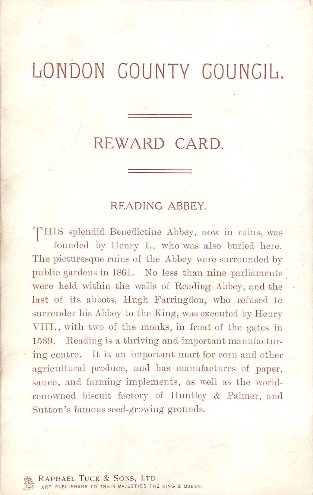 back:- THIS SPLENDID BENEDICTINE ABBEY, NOW IN RUINS, WAS FOUNDED BY HENRY I, WHO WAS ALSO BURIED HERE. THE PICTURESQUE RUINS OF THE ABBEY//SUTTON'S FAMOUS SEED-GROWING GROUNDS image from READING 2165