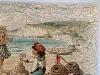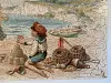 two children building sand castles on the shore, shrimp nets and traps beside them.