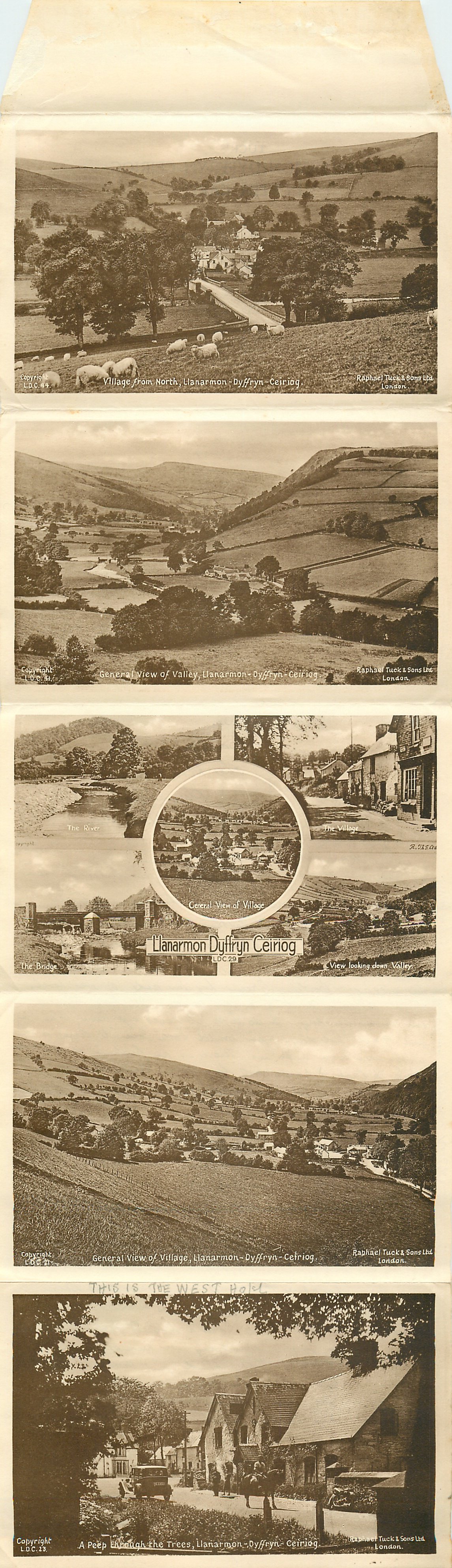 comes with COMMUNICATON on fold VILLAGE FROM NORTH, GENERAL VIEW OF VALLEY, 5 inserts THE RIVER, THE VILLAGE, VIEWING LOOKING DOWN VALLEY, THE BRIDGE, GENERAL VIEW OF VILLAGE, GENERAL VIEW OF VILLAGE, A PEEP THROUGH THE TREES LDC 23 same images as Tuck postcards LLANARMON-DYFFRYN-CEIROG, REAL PHOTOGRAPH LDC 23 LDC 29 same images as Tuck postcards LLANARMON-DYFFRYN-CEIROG, sepia LDC 29