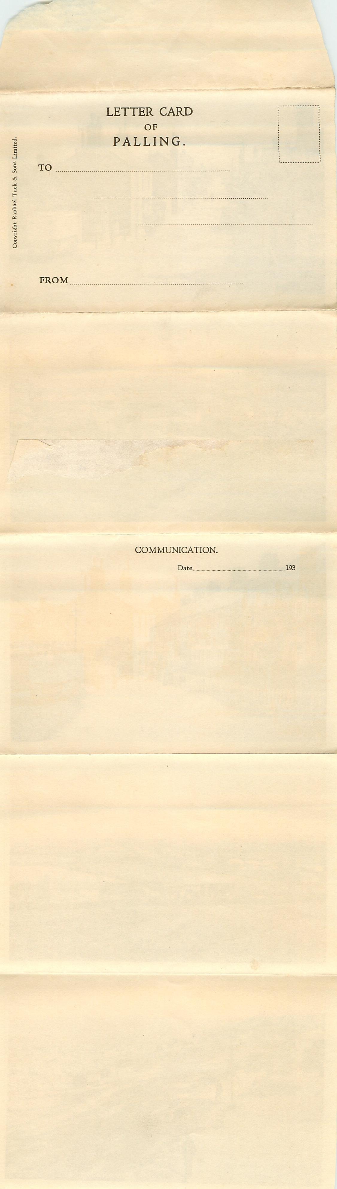 comes with COMMUNICATON on fold VIEWING FROM THE GAP, PALLING view of houses and row of hedges grows diagonally to the right BEACH ROAD, PALLING, view of sky is perfectly horizontal, THE BEACH PALLING view of houses and row of hedges grows diagonally to the right same image as Tuck PALLING
