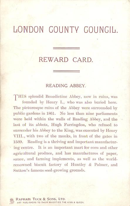 back:- THIS SPLENDID BENEDICTINE ABBEY, NOW IN RUINS, WAS FOUNDED BY HENRY I, WHO WAS ALSO BURIED HERE. THE PICTURESQUE RUINS OF THE ABBEY//SUTTON'S FAMOUS SEED-GROWING GROUNDS image from READING 2165