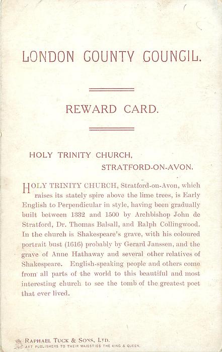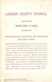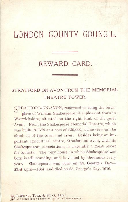 back:- STRATFORD-ON-AVON, RENOWNED AS BEING THE BIRTH-PLACE OF WILLIAM SHAKESPEARE, IT IS A PLEASANT TOWN IN WARWICKSHIRE//BORN ON ST. GEORGE'S DAY-23-11564, AND DIED ON ST. GEORGE'S DAY, 1616
