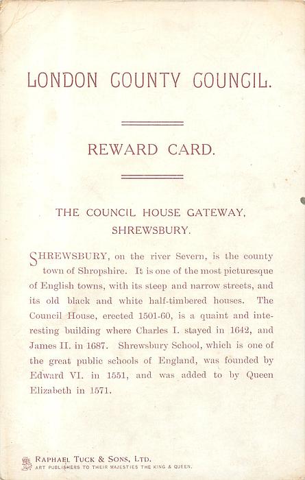 back:- SHREWSBURY, ON THE RIVER SEVERN,IS THE COUNTY TOWN OF SHROPSHIRE. IT IS ONE OF THE MOST PICTURESQUE OF ENGLISH TOWNS, WITH ITS STEEP AND NARROW STREETS//QUEEN ELIZABETH IN 1571 image from SHREWSBURY 1441