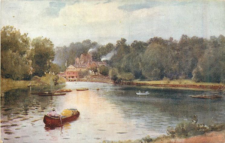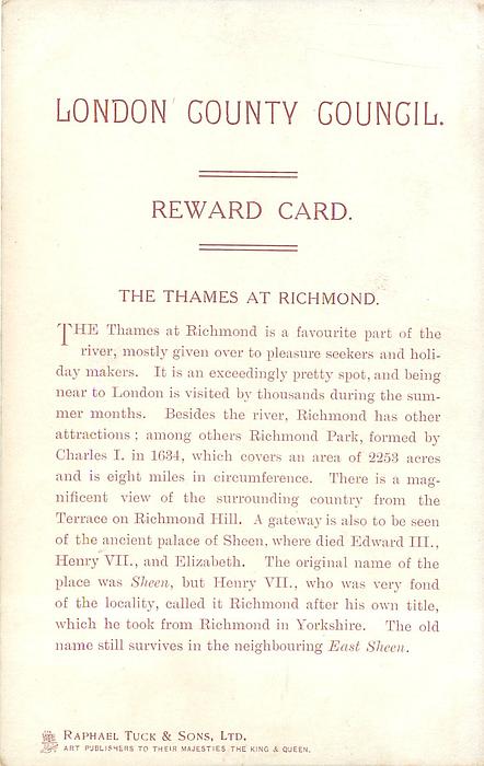 back:- THE THAMES AT RICHMOND IS A FAVOURITE PART OF THE RIVER, MOSTLY GIVEN OVER TO PLEASURE SEEKERS AND HOLIDAY MAKERS. IT IS AN EXCEEDINGLY PRETTY//NEIGHBOURING EAST SHEEN image comes from Quaint bits 2648