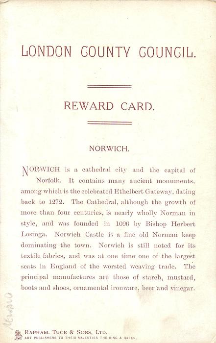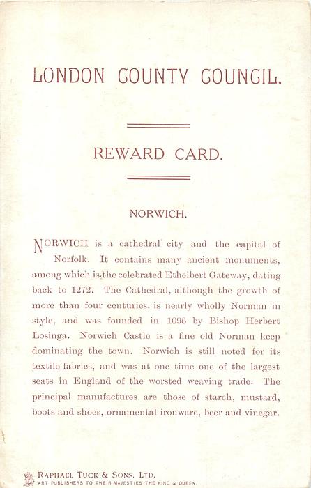 back:- NORWICH IS A CATHEDRAL CITY AND THE CAPITAL OF NOTFOLK. IT CONTAINS MANY ANCIENT MONUMENTS, AMONG WHICH THE CELEBRATED ETHELBERT GATEWAY//IRONWARE, BEER AND VINEGAR image from NORWICH 799