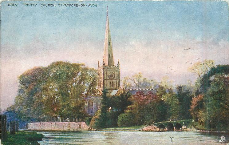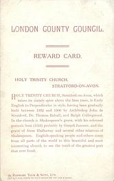 back:- HOLY TRINITY CHURCH, STRATFORD-ON-AVON, WHICH RAISES ITS STATELY SPIRE ABOVE THE LIME TREES, IS EARLY ENGLISH TO PERPENDICULAR IN STYLE//IN THE CHURCH IS SHALESPEARE'S GRAVE//GREATEST POET THAT EVER LIVED image from STRATFORD-ON-AVON 774