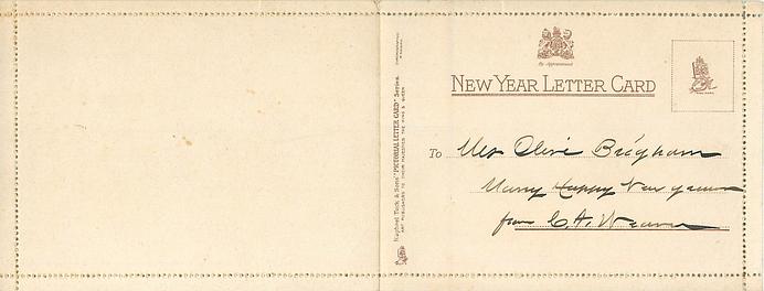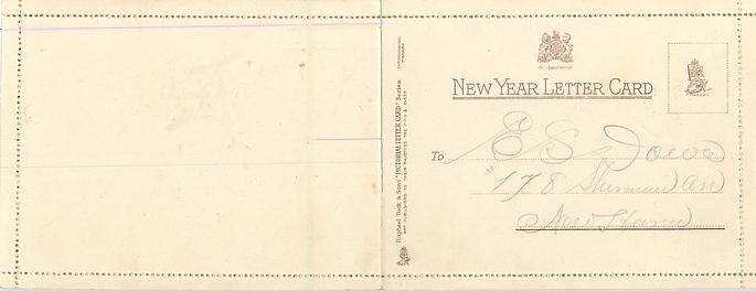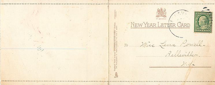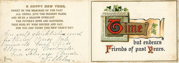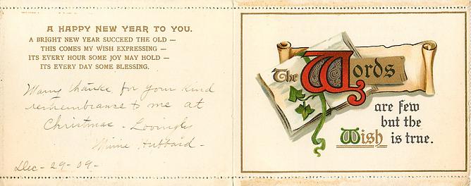 A HAPPY NEW YEAR SWEET BE THE MEMORIES OF THE PAST ALL GENIAL JOYS THE PRESENT BLESS, AND NE'ER A SHADOW OVERCAST THE FUTURE'S HOPE AND HAPPINESS, THUS RUNS MY WISH SINCERE AND GAY, FOR YOU AND YOURS THIS NEW YEAR'S DAY used in 1929